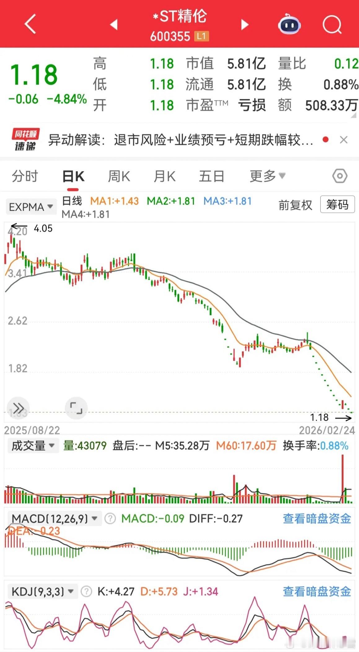 同是风险警示股,命运天差地别。ST京蓝逆势狂飙,而*ST精伦一路阴跌,每一次反弹更像是诱多,股价逼近“元关”,惨烈程度可见一斑。营收与净利润双踩线,退市风险高悬,曾经风光的概念,如今只剩一地鸡毛,庆幸当初及时抽身。
