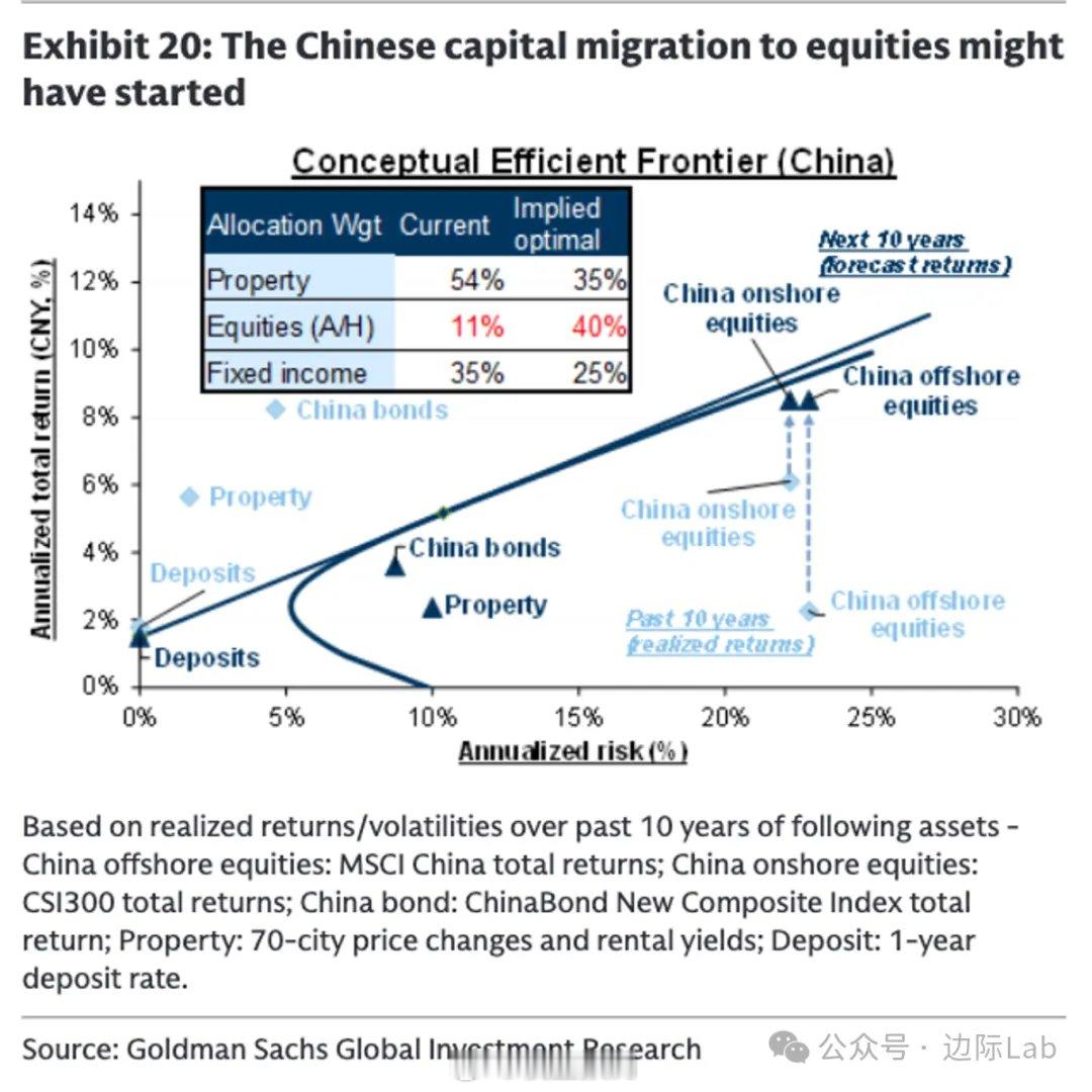 高盛:每年超过14万亿人民币的新增可投资金也将面临投向选择。高盛的有效前沿模型分析显示,中国居民当前的资产配置与理论最优状态存在巨大偏离,其在房产上的配置权重高达54%,而权益资产仅占11%,远低于模型测算的40%最优权重。驱动这一潜在结构调整的核心因素,在于资产预期回报率的分化。随着真实利率持续下行及股票风险溢价维持高位,权益类资产的相对吸引力显著增强,而房地产和现金类资产的预期回报则相形见绌。这一变化不仅可能触发存量资本从超配的房地产和现金向股市进行再配置,每年超过14万亿人民币的新增可投资金也将面临投向选择。