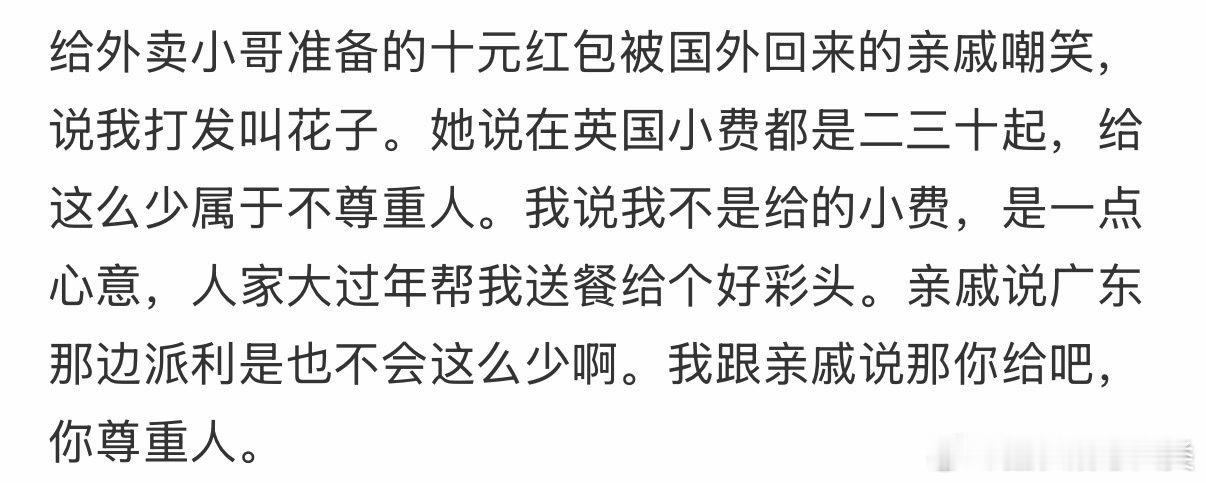 为外卖小哥准备的十元红包,竟被国外归来的亲戚嘲笑。