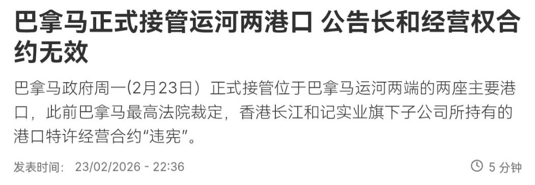 巴拿马对我们的反制与警告不予理会!巴拿马正式接管运河两港口!2月24日,根据法新社报道,法媒称,巴拿马政府周一(2月23日)正式接管位于巴拿马运河两端的两座主要港口。而此前巴拿马最高法院裁定,香港长江和记实业旗下子公司所持有的港口特许经营合约“违宪”。 巴拿马港口事务主管马克斯·弗洛雷斯在记者会上宣布:“巴拿马海事局已接管相关港口,并保证运营持续不中断。”很显然,在我们暂停所有中资新项目谈判,调整中资企业航线,强化海关检疫,并启动国际仲裁对巴拿马政府施压之后,巴拿马政府显然并未对我们的反制与施压予以理会,而是坚持强行接管。   咱们都知道,长和集团当年是通过正规招标拿下这两座港口经营权的,1997年就开始运营,后来按合同约定在2021年合法续期到2047年,这么多年来,企业投了十几亿美元,把原来的破败码头打造成了世界级的物流枢纽,给巴拿马创造了大量就业岗位,也缴了不少税,对当地经济的贡献明眼人都看得见。 可巴拿马最高法院突然在今年1月裁定这份履行了近三十年的合同“违宪”,理由说得冠冕堂皇,一会儿说续约没公开招标,一会儿说条款损害国家利益,这纯属找借口。 当年签约的时候怎么不说违宪?续约的时候审计部门都确认合规了,现在眼看着港口运营得越来越红火,就想撕毁合同,这不是见利忘义是什么?   更让人不能接受的是,面对咱们的反制措施,巴拿马政府居然完全不当回事。咱们已经够克制了,只是暂停了和他们的新基建项目谈判,调整了中资企业的航线,加强了海关检疫,还启动了国际仲裁来维护合法权益,这些都是正当合理的维权手段,目的就是希望巴拿马能回到谈判桌前,好好解决问题。 可他们倒好,不仅不理不睬,反而加快了强行接管的步伐,还马上找了丹麦和瑞士的公司来临时运营,这分明就是早就计划好的,所谓的“违宪裁定”不过是他们精心设计的幌子。   说到底,巴拿马这么做,根本不是什么维护国家利益,核心就是想重新分蛋糕。这两座港口是巴拿马运河的门户,承担着全球不少贸易货物的吞吐,每年营收好几亿美元,巴拿马政府看着这块肥肉,就想把更多利益攥在自己手里,觉得之前给长和的税收优惠让他们亏了,可他们忘了,当年要是没有外资进来投资建设,哪有今天这么赚钱的港口?现在翅膀硬了,就想把投资方一脚踢开,这种过河拆桥的做法,以后谁还敢去巴拿马投资?   而且这事儿背后明显有地缘政治的影子,美国早就对中资运营巴拿马运河相关港口心存不满,多次向巴拿马施压,这次巴拿马敢这么有恃无恐,少不了背后有人撑腰。 他们嘴上喊着“维护国家主权”,实际上是被别人当枪使,把一个纯粹的商业合作搞成了政治博弈的牺牲品。这种把经贸问题政治化的做法,只会破坏地区的稳定和发展,最后损害的还是巴拿马自己的利益。   长和集团已经明确表示巴拿马的行为不合法,要通过国际仲裁追究责任,这是完全正确的做法。咱们中国政府也多次表态,会坚决维护中国企业的正当合法权益,这让我们心里有了底。 但反过来想,巴拿马这么一闹,自己的国际信誉算是彻底毁了。一个国家要是连基本的契约精神都没有,动不动就撕毁合同、强行没收外资资产,以后谁还敢跟他们合作? 现在已经有不少投资者对巴拿马的投资环境产生了怀疑,他们的主权信用评级展望也被下调了,这就是不讲信用的代价。   咱们常说,做人要讲诚信,国家之间、企业之间合作更是如此。巴拿马运河是国际公共资源,不是哪个国家想怎么样就怎么样的。 巴拿马政府这种无视合同约定、无视国际规则、无视中方合理反制的行为,不仅伤害了中国企业的利益,也损害了全球投资者的信心,更破坏了国际经贸秩序。 他们以为强行接管就能占到便宜,其实是捡了芝麻丢了西瓜,失去的是长远的发展机会和国际社会的信任。   现在事情已经发生了,咱们不能忍气吞声,国际仲裁一定要坚持到底,让巴拿马为自己的行为付出应有的代价。 同时这也给咱们提了个醒,中国企业走出去不容易,遇到这种不讲理的国家,必须拿起法律武器维护自己的合法权益,而咱们国家作为后盾,也一定会坚定地支持企业维权。 巴拿马政府要是还执迷不悟,继续一条道走到黑,最后只会搬起石头砸自己的脚,被国际社会所孤立。