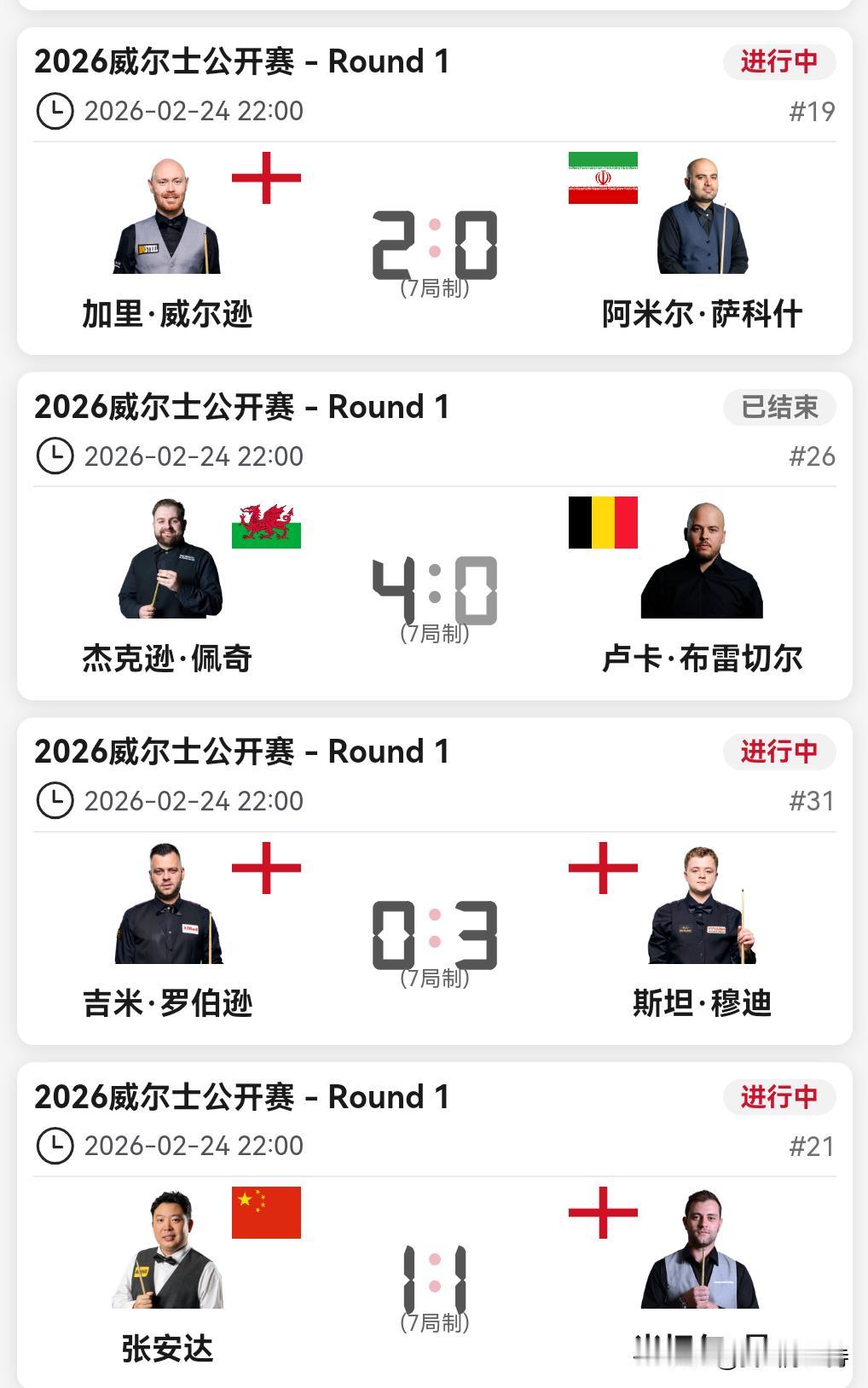 中国又有几员大将晋级威尔士公开赛32强,赵心童4-3战胜范争一,肖国栋4-3战胜龙泽煌,周跃龙4-0战胜乌森巴赫。 赵心童赛后接受威廉姆斯访谈说,自己很幸运拿下这个比赛。之前自己碰到马威、希金斯、塞尔比这样选手,1-4落后就觉得自己完蛋了,但是现在觉得有可能逆转。问赵心童打这么多比赛不累吗,为什么没打算休息一下。赵心童说,他热爱这个运动,就是想打比赛,想一个接一个的拿冠军。 范争一表现还是不错,但是围球能有所欠缺,导致失力。 周跃龙还是展现了不俗的实力,4-0轻取乌森巴赫。 肖国栋和龙泽煌打得都不好,失误也很多,最终肖国栋4-3胜出。 张安达的比赛还正在进行。卢卡布雷被佩奇淘汰。