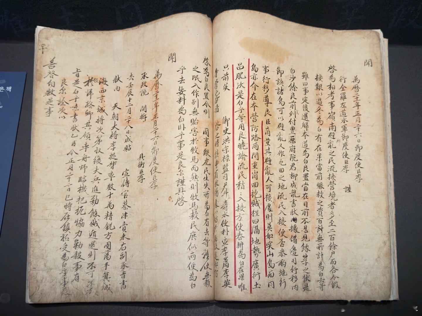这次展示展出了一些和李舜臣相关的大量一手资料,这让人更容易看到一个破除神话后,面对各种困境而积极作为的优秀水军将领。其中包括一些平时根本不展出的国宝文物:1. 图2-4 国宝76号 李舜臣《乱中日記》《书简帖》《壬辰狀草》牙山忠武公李舜臣纪念馆藏2. 图6 国宝132号柳成龙《惩毖录》,1596安东韩国文化振兴院藏3. 图7 国宝248号朝鲜方域之图,1557国史编撰委员会藏4. 图5 2023年8月4日指定国宝李舜臣长剑一对,1594,太贵连、李茂生作牙山忠武公李舜臣纪念馆藏