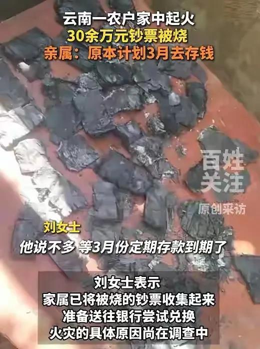 云南一农户老夫妻家中起火,30万现金被烧成炭灰。儿女们说:爸爸妈妈存的这些钱是这些年省吃俭用才积攒的,问他有多少,他说不多。结果烧了才说出来有30万。儿女们将被烧的钞票收集起来,看能不能去银行兑换,能兑换多少是多少。估计损失会挺严重的,已经烧的看不出人民币原来的模样。