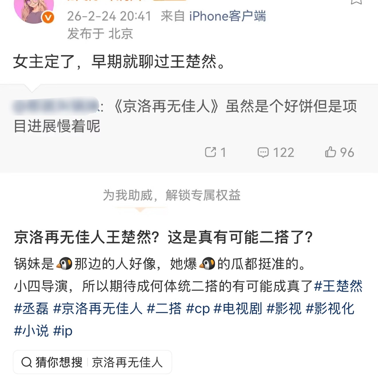 丞磊和王楚然也要二搭了,二人将合作《京洛再无佳人》,这个饼怎么样?