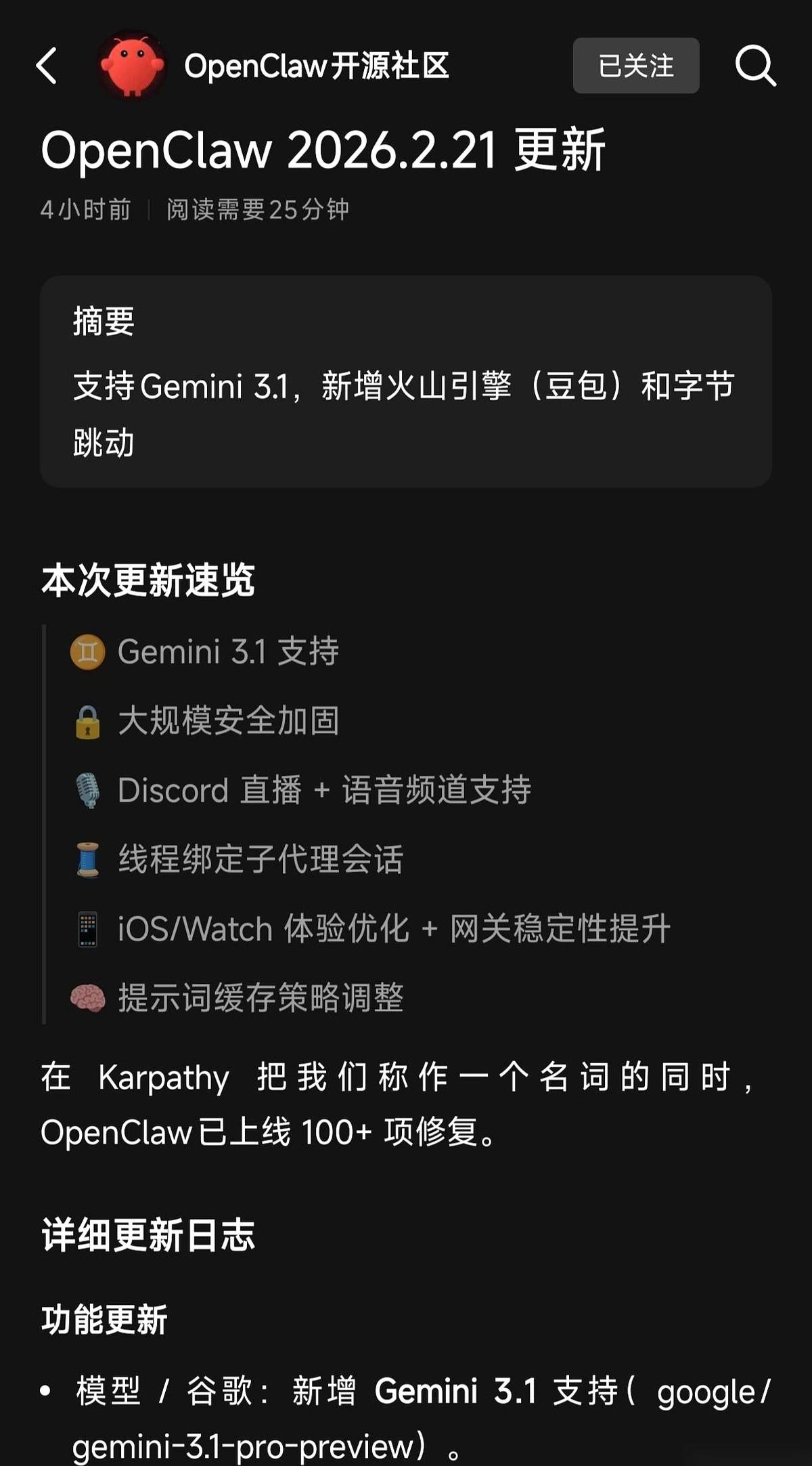 别睡了,都起来看看 OpenClaw 干了啥大事! 我滴个乖乖,Gemini 3.1,最新的,最猛的,直接给你塞进来了。 这哪是版本更新啊,这简直是把拖拉机引擎直接换成了火箭推进器,连个招呼都不打,直接原地起飞。 但你知道最让我心里踏实的是什么吗? 不是新功能有多炫。 是“大规模安全加固”这几个字。 真的,玩技术的到最后,拼的不是谁跑得快,而是谁活得久。这年头,你家里再豪华,门锁要是纸糊的,你睡得着觉吗? 一个只知道往前猛冲,却忘了给你安个好刹车、加固一下底盘的工具,你敢把身家性命押上去吗? 显然,OpenClaw 这帮人是真懂。 他们不仅给了你一把削铁如泥的宝剑,还顺手递过来一面坚不可摧的盾牌。 告诉你:去闯吧,大胆地去折腾,背后有我。 这种感觉,太TM爽了。 不说了,我去更新了。