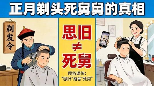 《“正月剃头死舅舅”的真相》 民间一直流传着“正月剃头死舅舅”的说法,使得不少人在正月对剃头这事忌讳颇深。其实啊,这背后藏着一段特别的历史。 清朝初期,统治者强制汉人剃发留辫,这可惹恼了汉人。为了表达对前朝的怀念,大家就商量着正月里不剃头,取“思旧”之意。可没想到,由于北方方言中“思旧”和“死舅”发音太像了,传来传去就变了味,成了“正月剃头死舅舅”。 从科学层面讲,剃头不过是日常生活中的个人打理行为,跟亲人的生死毫无瓜葛。这一说法只是历史长河中的一个误传罢了。了解了真相后,就不用被这没科学依据的说法束缚啦,正月里想剃头就去剃。咱们可以把它当作一个有趣的文化现象,感受历史文化在岁月中的奇妙变迁。初一剃头纳福 剃头习俗