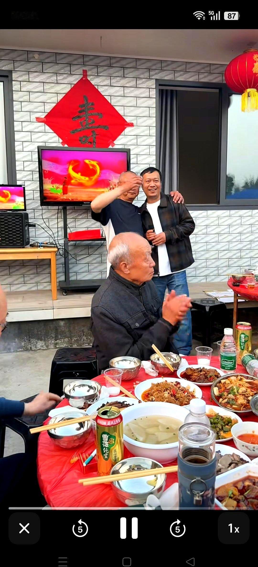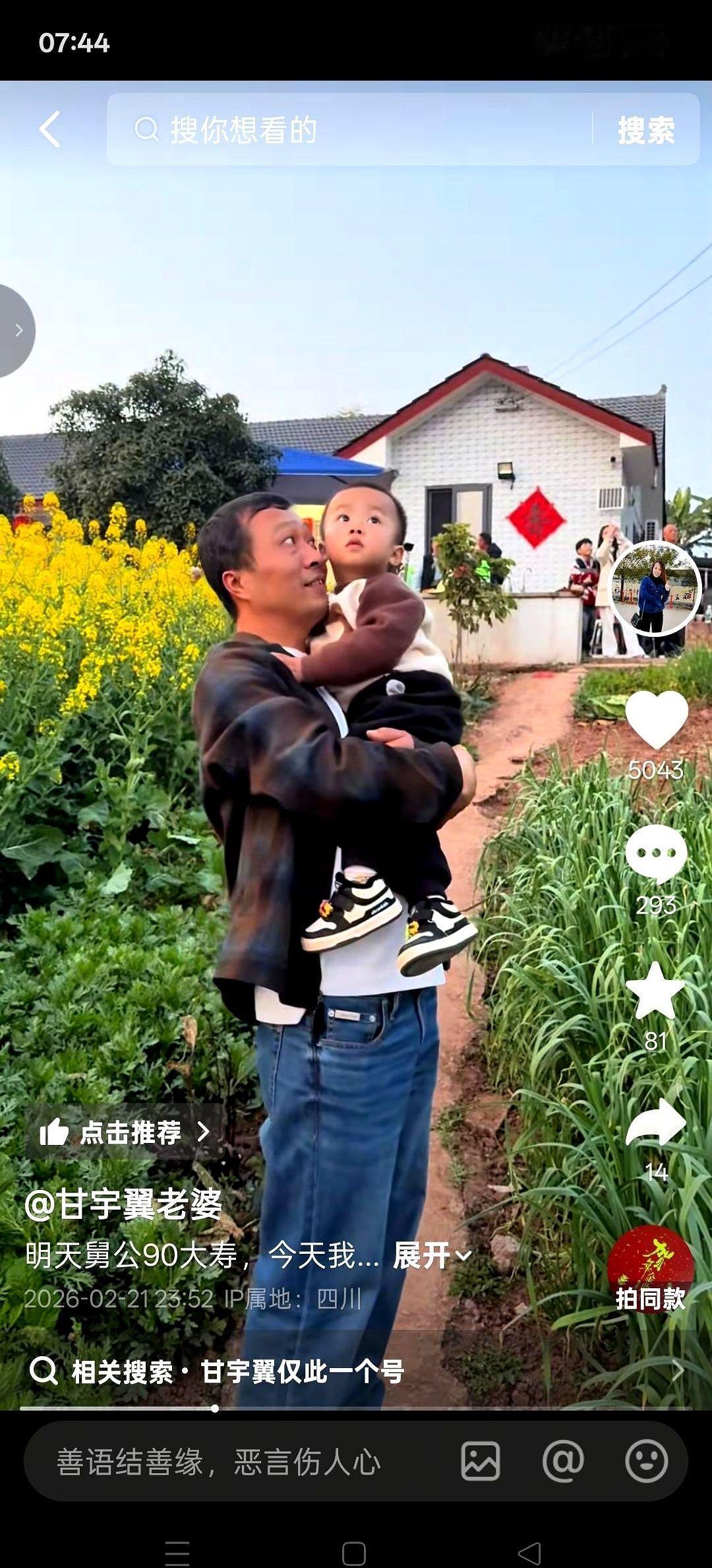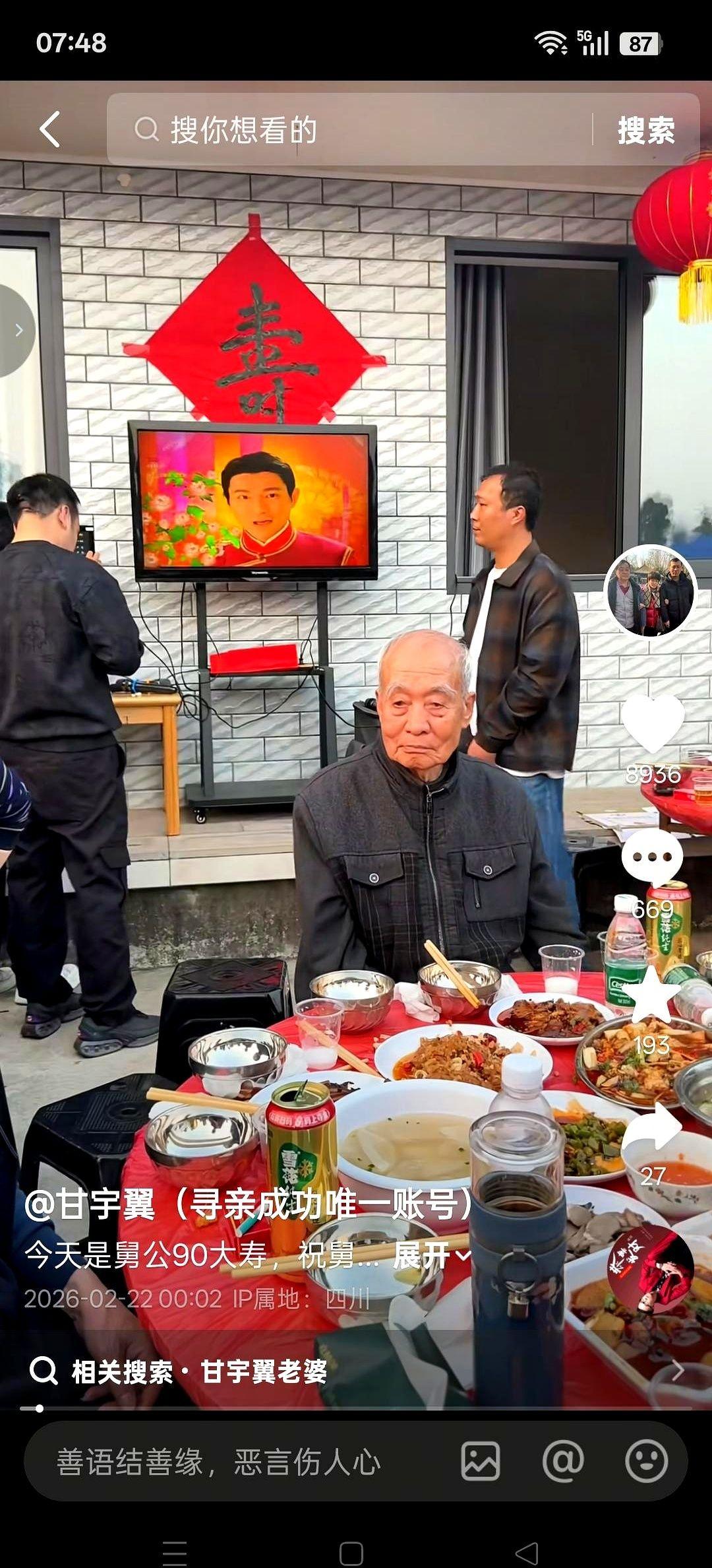 舅公90岁大寿的宴席上,甘爷爷的眼睛就没从台上挪开过。 台上唱歌的,不是哪个请来的角儿,是他自己儿子宇翼。一个抱着自己娃的爹,可在老爷子眼里,好像跟那个满地跑的小孙子,没啥两样。 全家七口人,从四川老家赶过来,阵仗搞得这么大,就为了这一眼。 宇翼一开嗓,底下嗡嗡的说话声瞬间就小了。歌是喜庆的,调子是欢快的,他一只手拿着话筒,另一只手还跟着比划。 老爷子就那么靠在椅子上,嘴角挂着笑,也不跟旁边人搭话,一双眼睛就这么直勾勾地盯着儿子,那种眼神,混着点骄傲,又带点疼,好像台上那个高高大大的男人,还是当年那个需要他抱起来才能够到糖罐子的小屁孩。 一曲没唱完,这边敬酒的杯子已经举起来了,那边捧着花的小辈挤到跟前,几个婶婶姑姑,干脆在旁边跟着节奏拍手跺脚,临时凑了个伴舞团。 歌唱完,外面“嘭”的一声,烟花炸了。 宇翼下台,一把抱起自己儿子。奶奶转身,又把二孙女搂进怀里。一家人就这么齐齐整整地站在窗边,看着天上一朵一朵炸开的亮光。 啥叫家底厚?不是金山银山,就是一个九十岁的老人办寿,他儿子还能亲自上台给他唱堂会,这就叫家底。