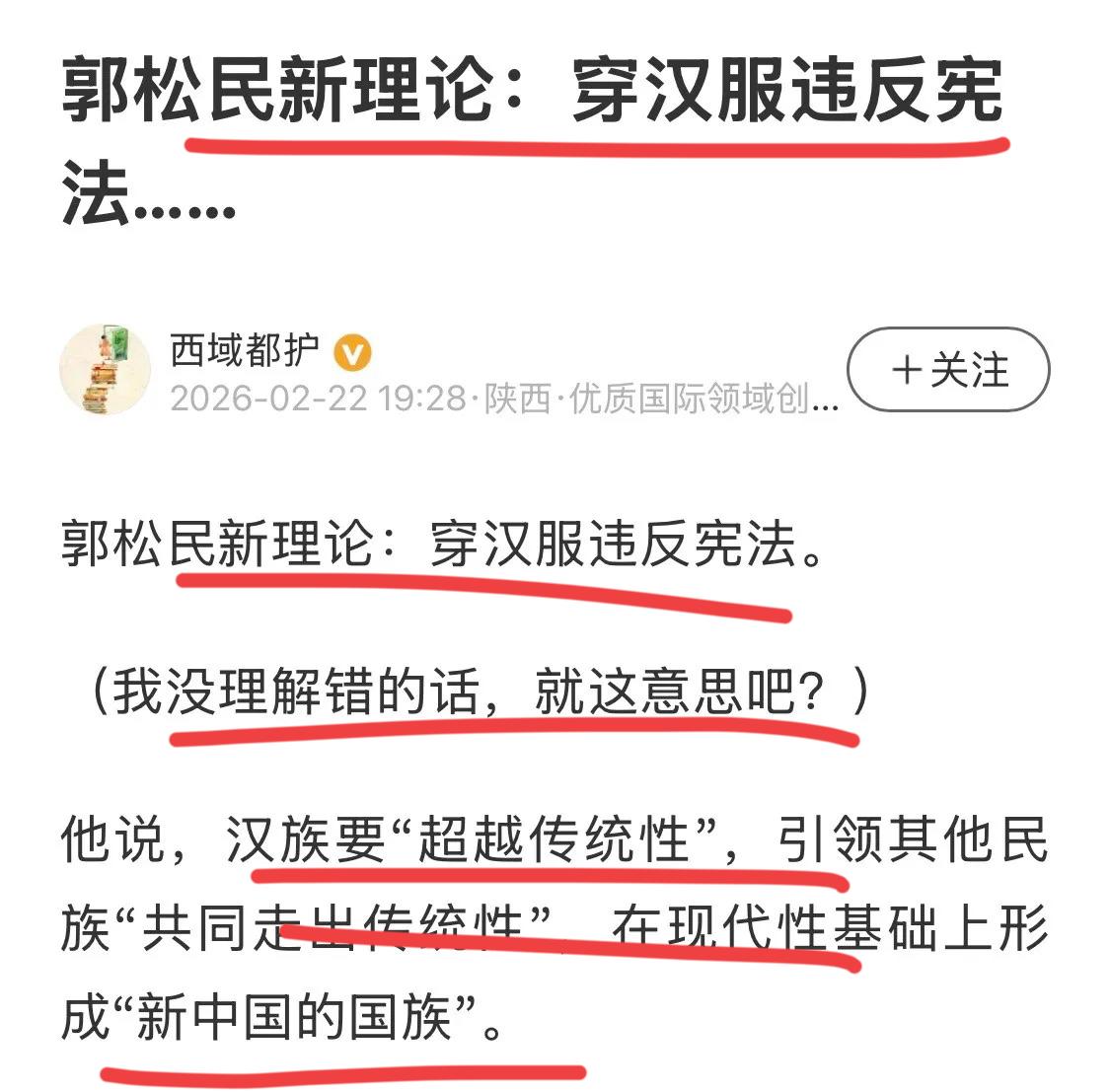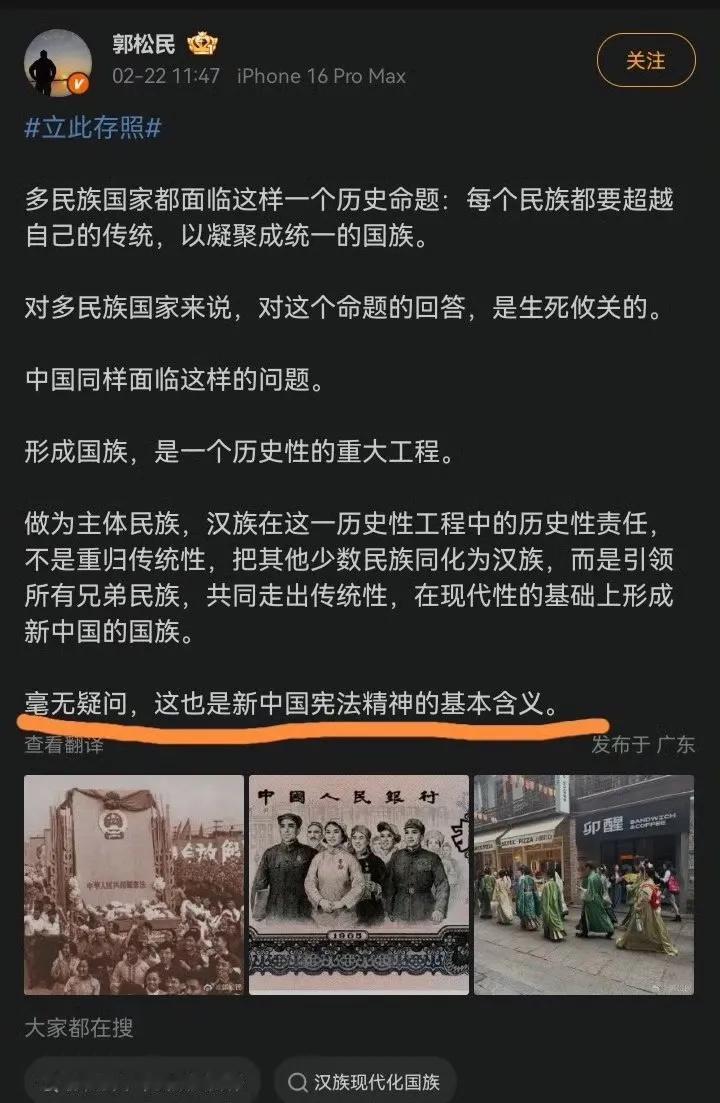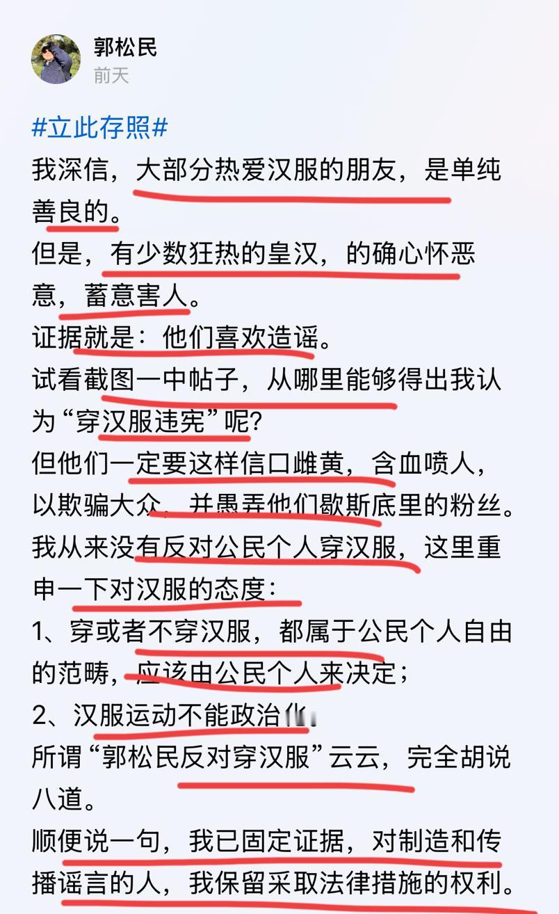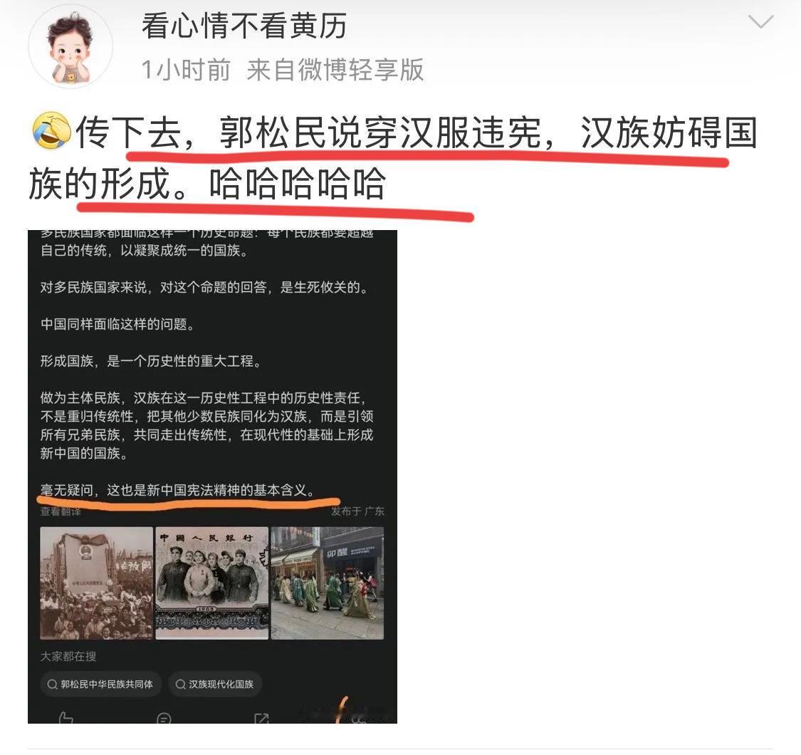 昆仑策高级研究员郭松民彻底发怒了! 他因为谈了穿汉服的问题,引发网友的怒批和嘲讽,甚至有网友发文解读了郭总发文内容的真实意思和意图!! 老郭看完后彻底破防了,他发怒了,扬言已经固定证据,要起诉这些网友造谣! 他的意思是,个人穿汉服当然没问题,他并不反对,但不能打大家都一起穿,搞成ZZ化和运动是不行的,他坚决反对!他还引用了北大中文系著名孔教授发明的词汇,皇汉,极端皇汉要不得! 这还算好的,孔教授直接怒骂这些人的汉奸! 我的天呢,倒反天罡了,这帮人要干啥? 穿个汉服像挖了他家祖坟一样?到底咋了? 对此你有何看法呢??