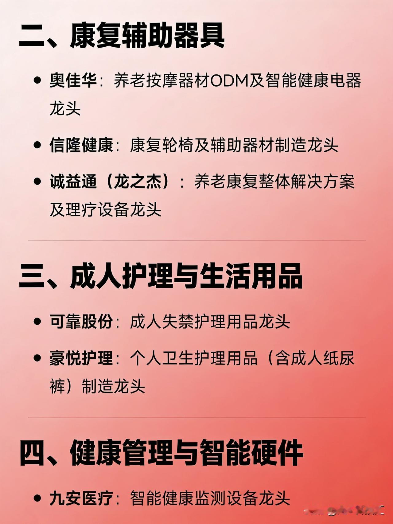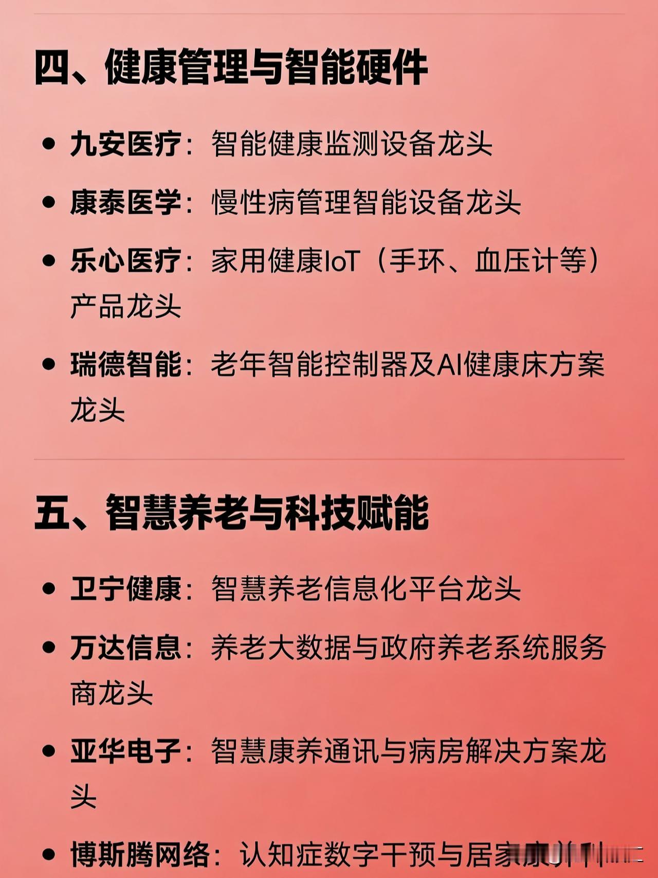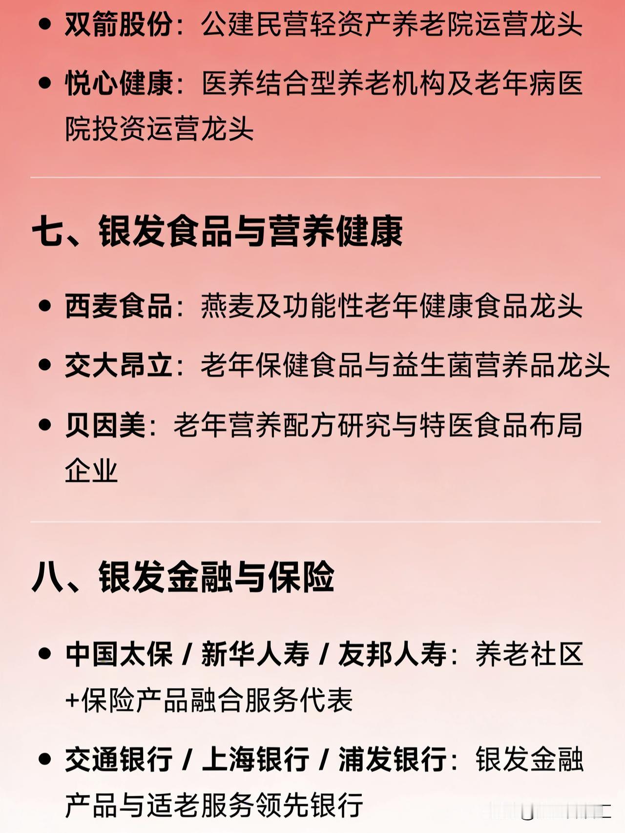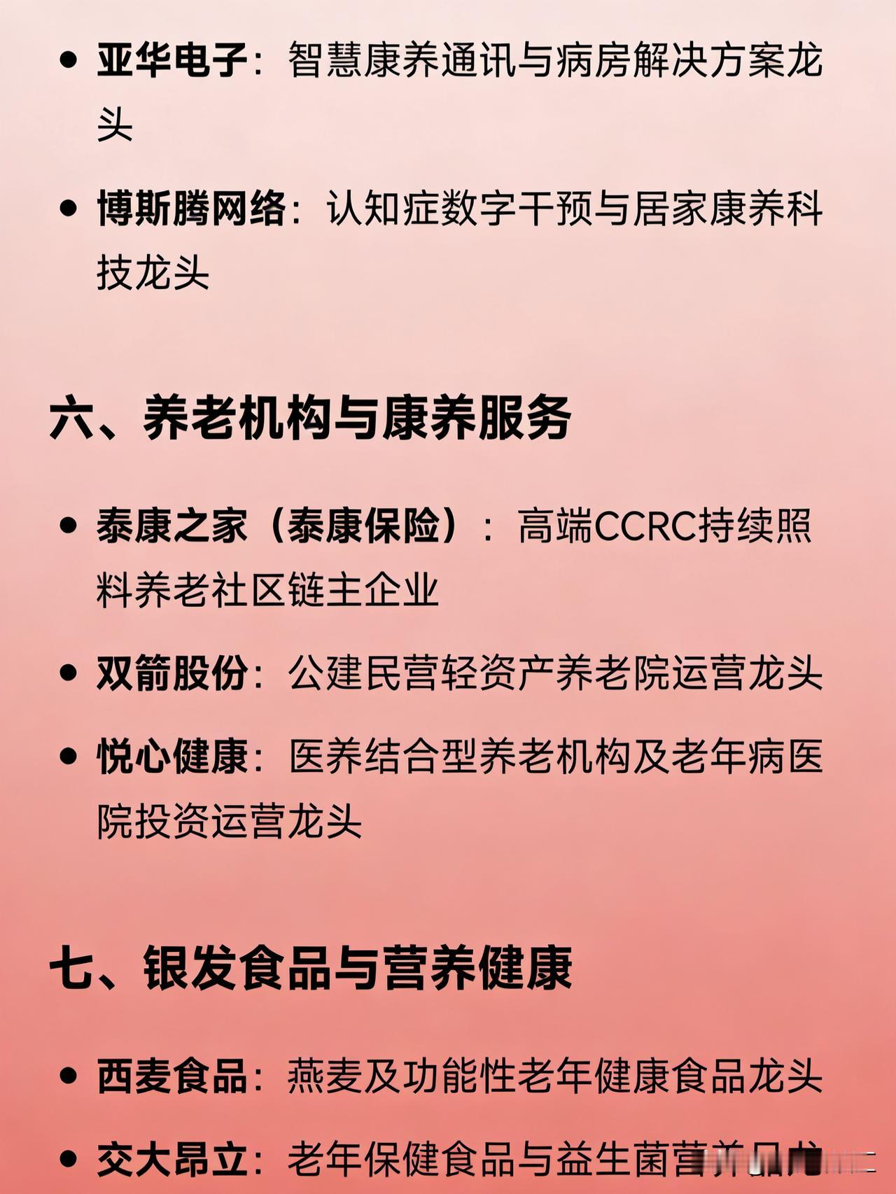 银发经济概念细分龙头企业汇总 一、医药健康(慢病/老年病治疗) 华润三九:中医药“健养+诊疗”综合服务龙头 以岭药业:心脑血管与呼吸系统中成药龙头 众生药业:老年慢病治疗县域服务龙头 昆药集团:三七产业链及心脑血管中成药龙头 鱼跃医疗:家用呼吸器械、糖尿病及康复器械龙头 爱尔眼科:老年性眼病诊疗服务龙头 美年健康:老年疾病预防与健康筛查龙头 国际医学:全生命周期医养结合服务龙头 二、康复辅助器具 奥佳华:养老按摩器材ODM及智能健康电器龙头 信隆健康:康复轮椅及辅助器材制造龙头 诚益通(龙之杰):养老康复整体解决方案及理疗设备龙头 三、成人护理与生活用品 可靠股份:成人失禁护理用品龙头 豪悦护理:个人卫生护理用品(含成人纸尿裤)制造龙头 四、健康管理与智能硬件 九安医疗:智能健康监测设备龙头 康泰医学:慢性病管理智能设备龙头 乐心医疗:家用健康IoT(手环、血压计等)产品龙头 瑞德智能:老年智能控制器及AI健康床方案龙头 五、智慧养老与科技赋能 卫宁健康:智慧养老信息化平台龙头 万达信息:养老大数据与政府养老系统服务商龙头 亚华电子:智慧康养通讯与病房解决方案龙头 博斯腾网络:认知症数字干预与居家康养科技龙头 六、养老机构与康养服务 泰康之家(泰康保险):高端CCRC持续照料养老社区链主企业 双箭股份:公建民营轻资产养老院运营龙头 悦心健康:医养结合型养老机构及老年病医院投资运营龙头 七、银发食品与营养健康 西麦食品:燕麦及功能性老年健康食品龙头 交大昂立:老年保健食品与益生菌营养品龙头 贝因美:老年营养配方研究与特医食品布局企业 八、银发金融与保险 中国太保 / 新华人寿 / 友邦人寿:养老社区+保险产品融合服务代表 交通银行 / 上海银行 / 浦发银行:银发金融产品与适老服务领先银行