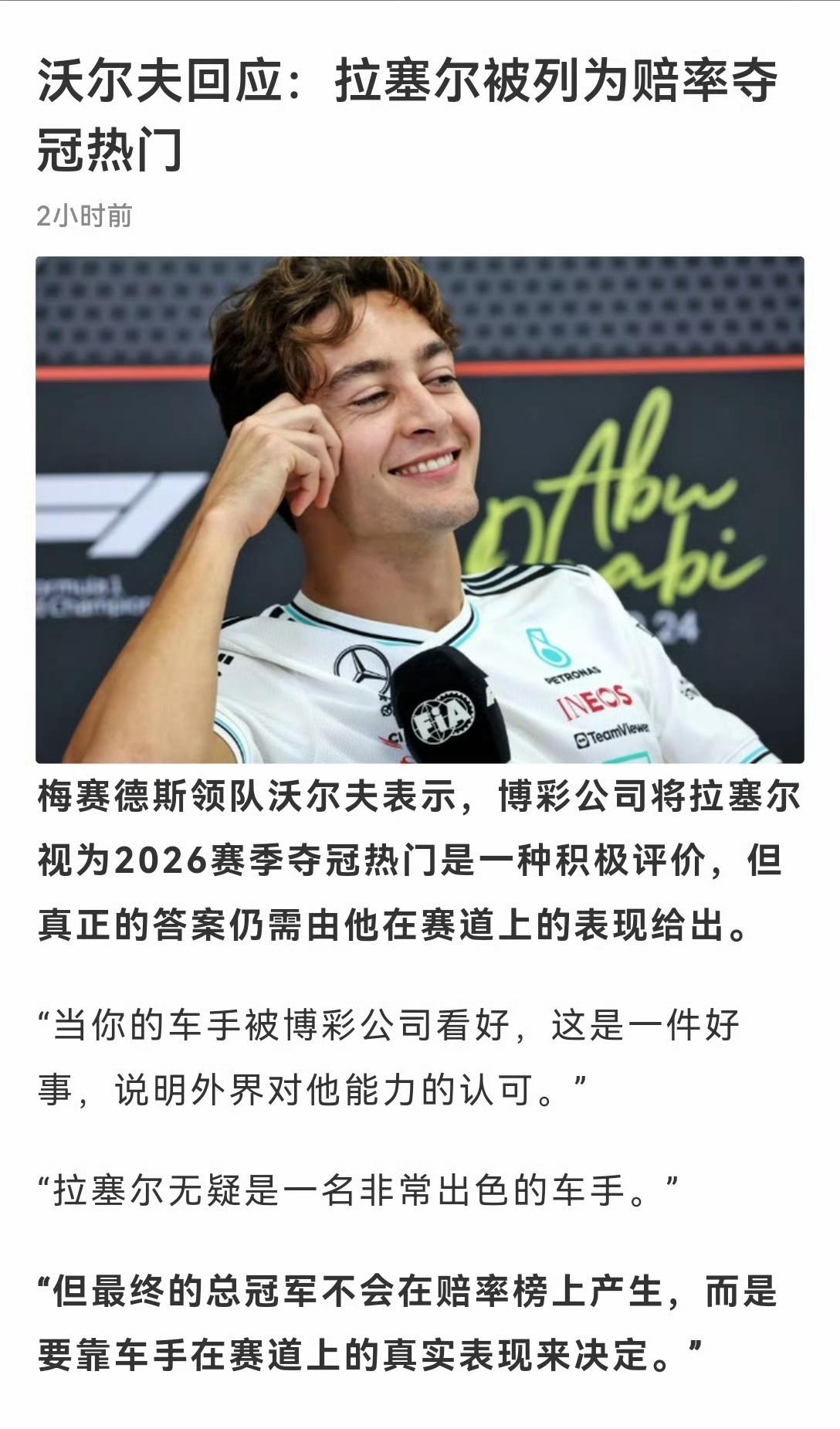 2026F1新赛季即将揭幕,随便做几个疯狂而又大胆的预测。 1、周冠宇很有机会替补登场,凯迪拉克本赛季不求成绩,只求流量。 2、拉塞尔极有可能夺得车手总冠军,法拉利夺得车队总冠军。 3、维斯塔潘依然会是老二。 4、卫冕冠军诺里斯本赛季至少拿到2场胜利,皮亚斯特里能够匹配。 5、勒克莱尔本赛季将至少拿到4场胜利,七冠王汉密尔顿至少拿到2场胜利。