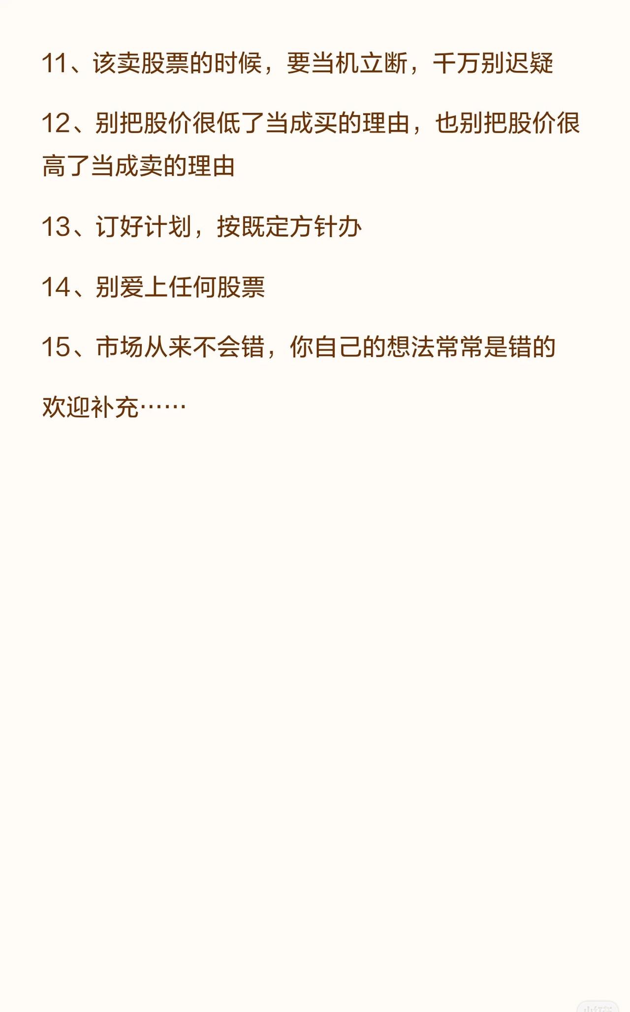 “炒股的智慧”这 15 条建议系统总结如下,方便你快速理解和应用: 一、先懂规则,再进市场 1. 玩游戏之前,先搞清楚游戏规则,面对人为操纵的赌局,一定要摸清对方的心理。 2. 跟着股市走,别跟朋友走。 3. 市场从来不会错,你自己的想法常常是错的。 二、风险控制是生命线 4. 止损,止损,止损。 5. 分散风险。 6. 避免买太多种股票。 7. 有疑问的时候,离场。 三、交易纪律与心态管理 8. 忘掉你的入场价。 9. 别频繁交易。 10. 不要向下摊平。 11. 别让利润变成亏损。 12. 该卖股票的时候,要当机立断,千万别迟疑。 13. 别把股价很低了当成买的理由,也别把股价很高了当成卖的理由。 14. 订好计划,按既定方针办。 15. 别爱上任何股票。 核心理念: - 先学规则,再下场。 - 严控风险,不侥幸。 - 按纪律交易,不被情绪左右。 - 尊重市场,不固执己见。