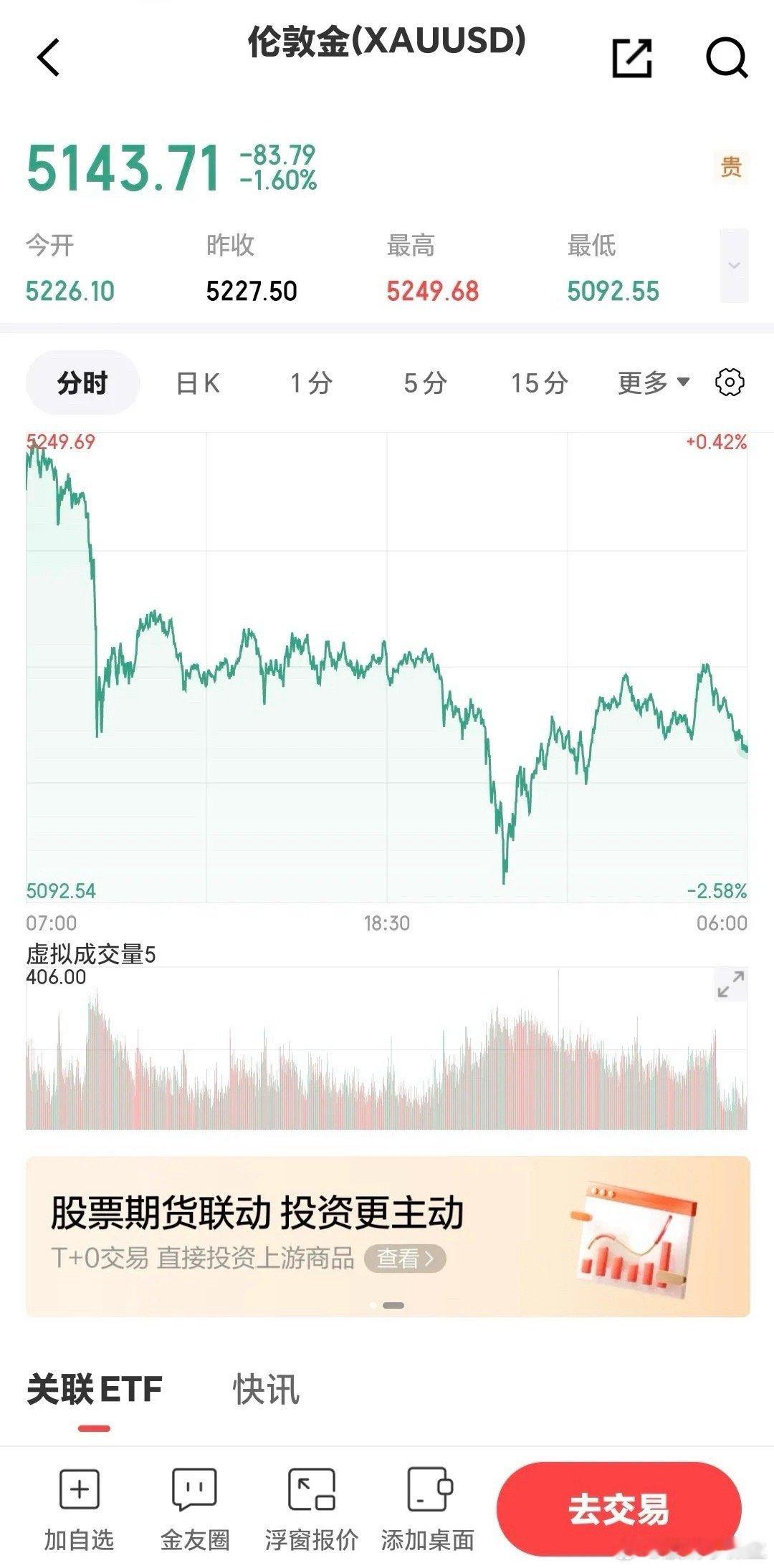 周二伦敦金冲高回落,回顾一下当日运行情况。昨日伦敦金开盘5226.1美元,盘中最高升至5249.68美元,最低跌至5092.55美元,最终收盘于5143.71美元,较上一日下跌83.79美金。