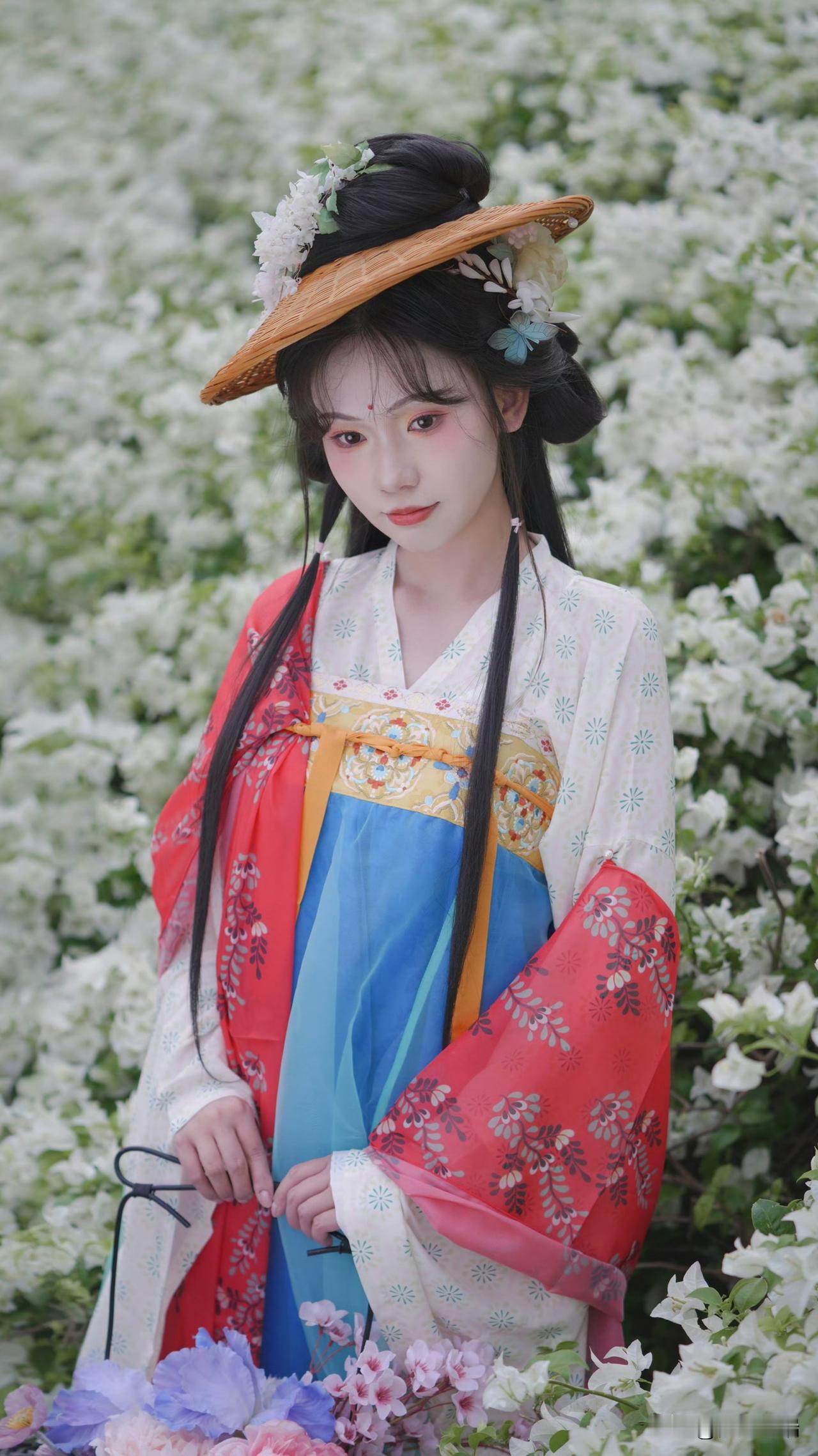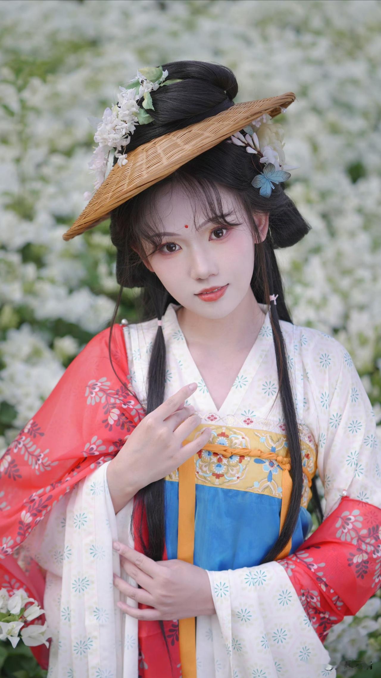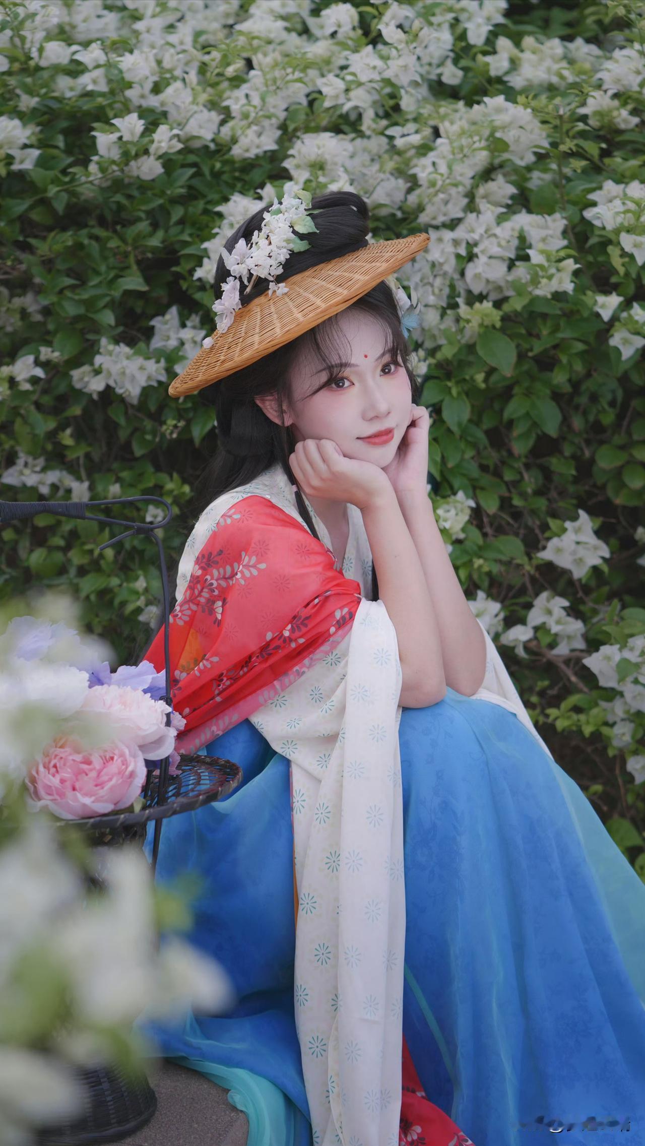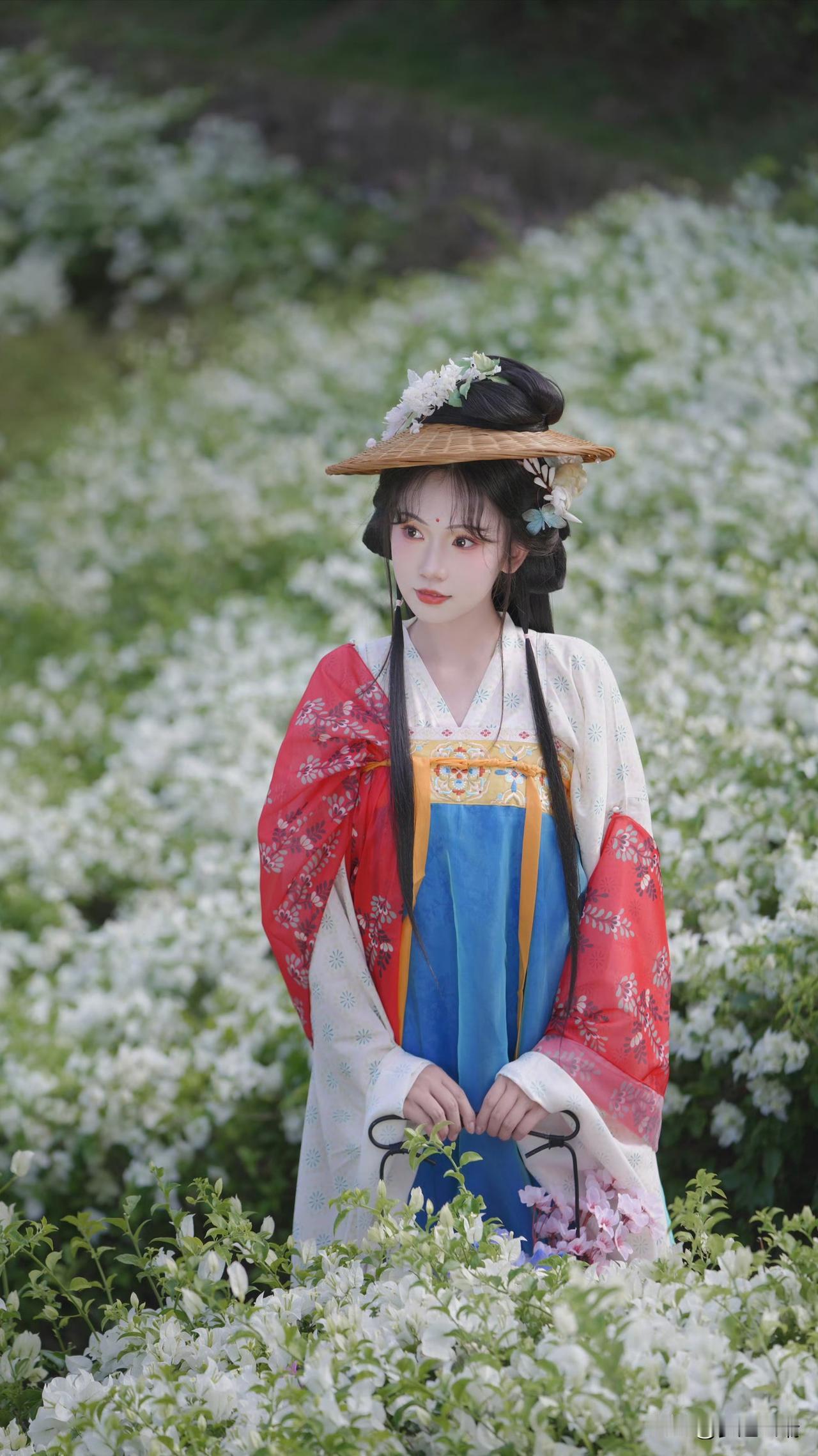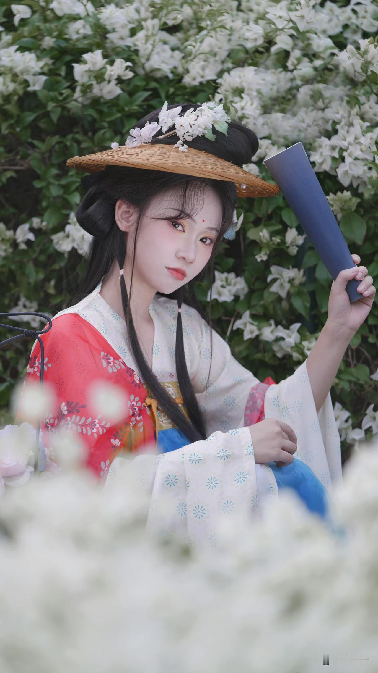 白色连衣裙在绿意盎然的背景下显得格外动人。