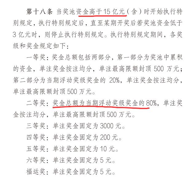 二等奖99万超高水平源于如下规定:奖池超15亿时执行特别规定,二等奖返奖金额从浮动奖级的25%迅速提升到80%,即高奖池期间每期销量的返奖重点加强二等奖,这是昨晚二等奖爆发的基础,但事实上近期奖池一直超15亿执行特别规定,所以爆发的更大原因还是固定奖数量偏少,尤其新设的福运奖不过700多万注是新规最差水平,固定奖返奖少了浮动奖自然就多,而二等奖又能拿大头,综合而来肯定就是超高水平奖金。 另外新规明确二等奖单期总返奖限额7000万、单注最高500万,而当期64注99.4万总返奖已达到6361万元,非常接近7000万限额封顶,再多中几注奖金就得下调了。 所以,结论就是,当期99万二等奖差不多就是新规能实现的极限,再高非常非常难,天花板大概就是这个数额啦!