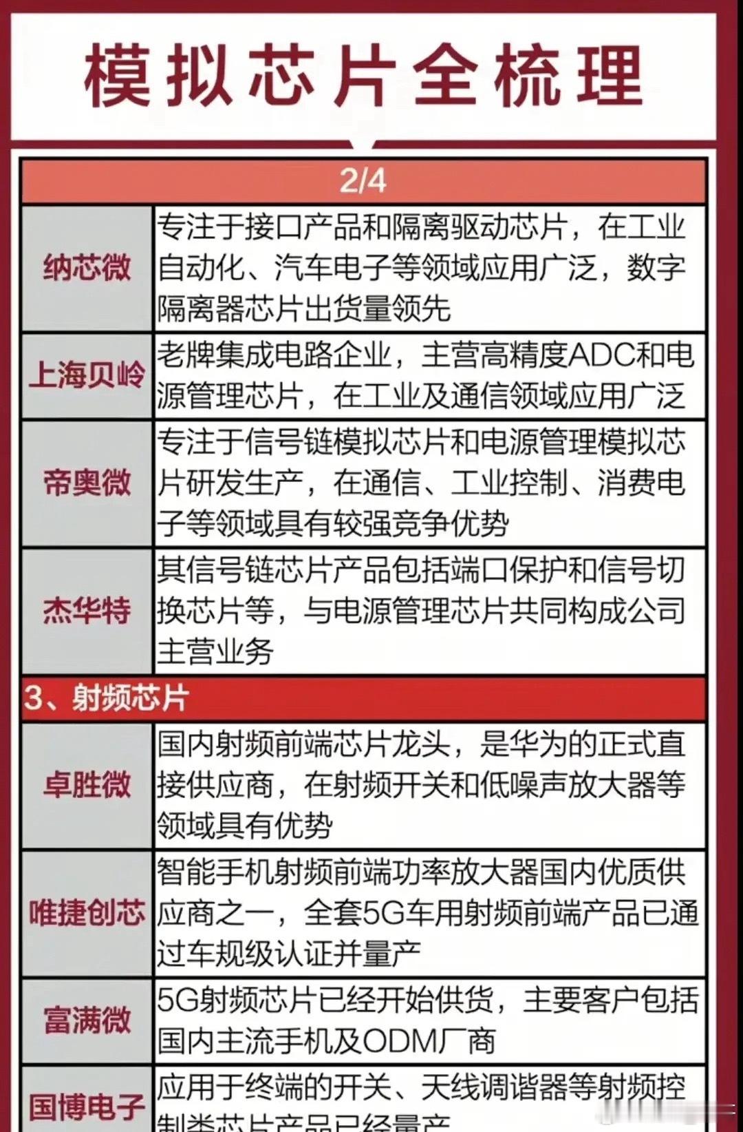 国产模拟芯片全梳理!从电源管理、信号链到射频芯片,龙头企业卡位核心赛道,国产替代加速推进。各细分领域龙头代表有士兰微、圣邦股份、上海贝岭等等。