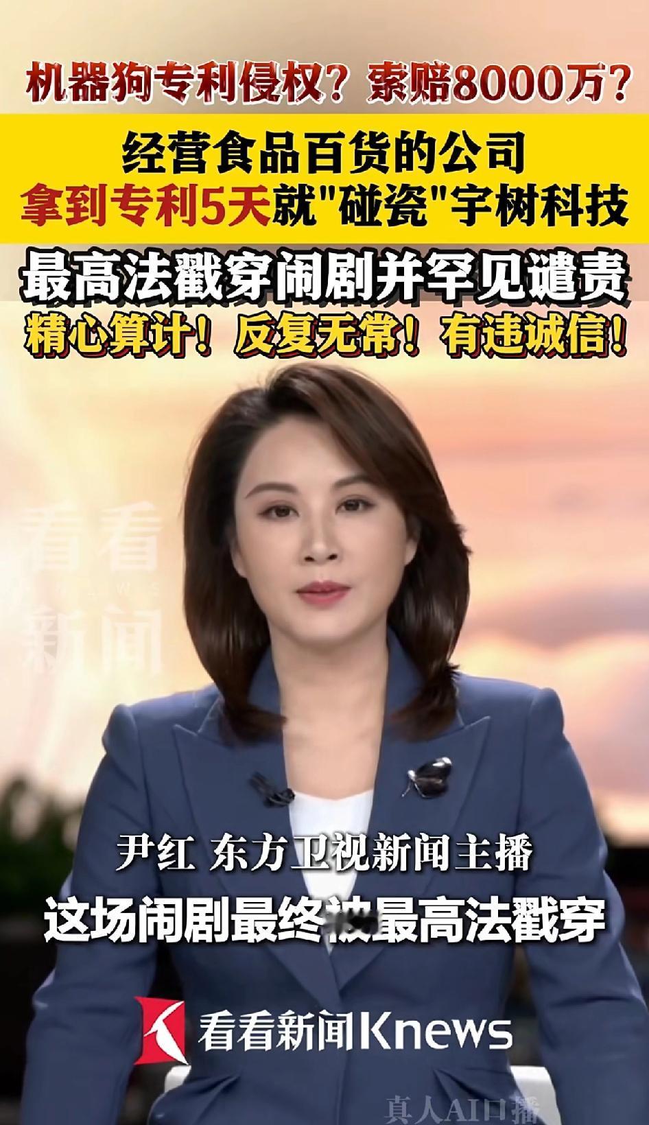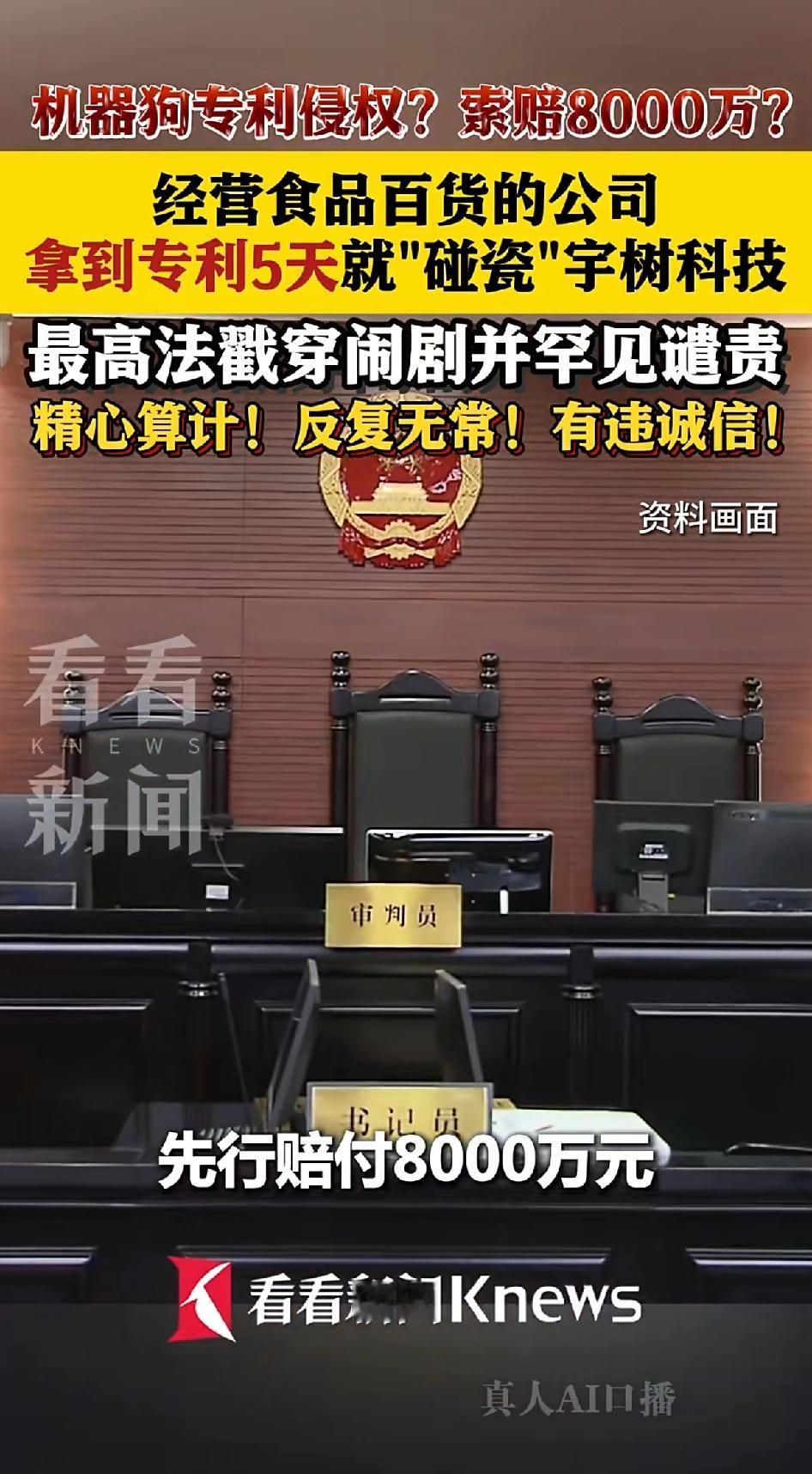 机器狗专利侵权?索赔8000万?经营食品百货的公司,拿到专利“5天”就碰瓷宇树科技!现在这专利碰瓷的事儿真是防不胜防啊!有家经营食品百货的公司,拿到机器狗专利才“5天”,就跑去索赔宇树科技8000万,这操作也太秀了。 正常来说,搞机器狗研发得有深厚的技术积累和专业背景吧,一家卖食品百货的公司突然冒出来个机器狗专利,怎么看都觉得不对劲。最高法院拆穿闹剧并罕见谴责,精心算计!反复无常!有违诚信! 这家食品公司很可能就是看准了宇树科技在机器狗领域的影响力,想趁机捞一笔。8000万真是一笔不小的资金,有人靠着碰瓷赚钱,有人拿着专利想碰瓷,这真是想钱想疯了。 这种专利碰瓷不仅会消耗被碰瓷企业的时间和精力,还会影响行业的创新环境。希望相关部门能好好管管,别让这些不良行为得逞,让真正搞研发的企业能安心发展。