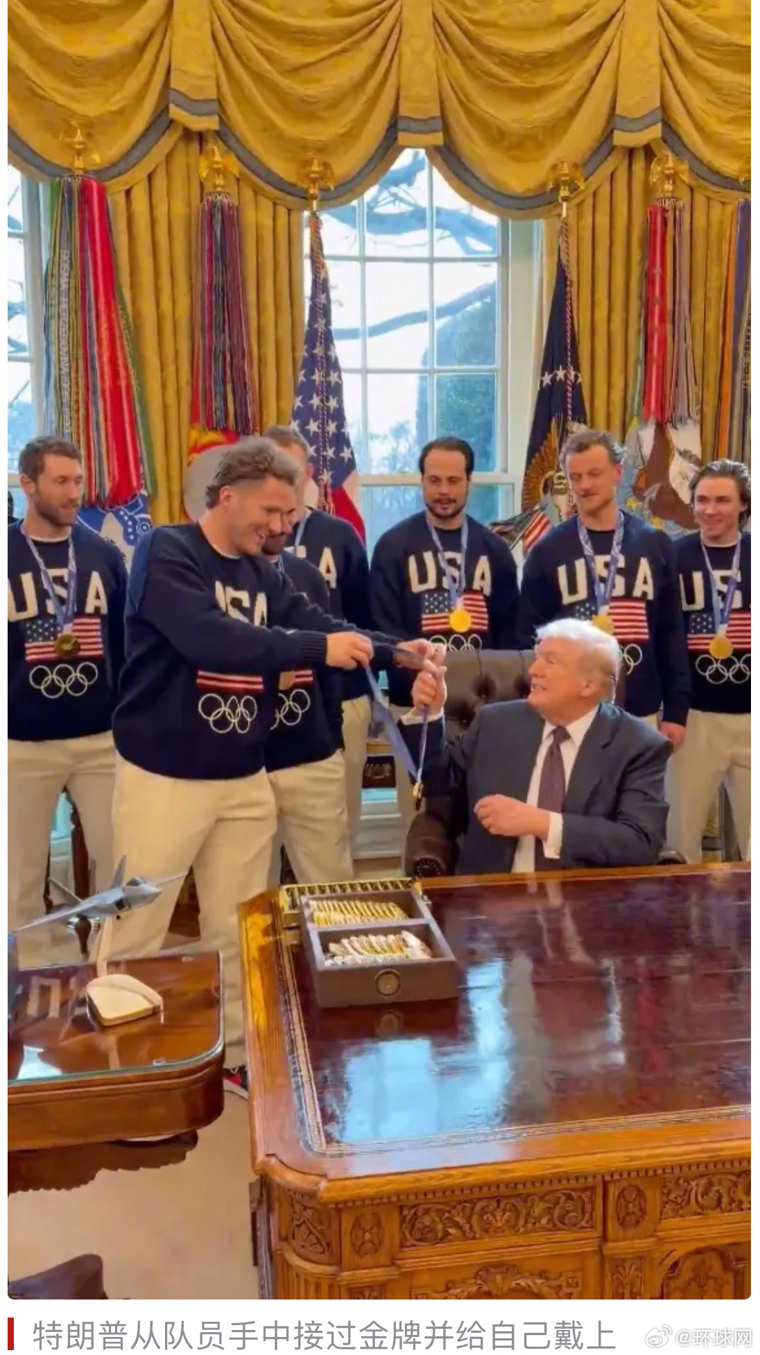 根据现场视频,在椭圆形办公室里,美国男子冰球队的运动员列成一排站在特朗普的身后,其中一名队员将奥运金牌递给特朗普。特朗普给自己戴上金牌,并开玩笑说“我不会把它还回去的”,引发在场人员的笑声。