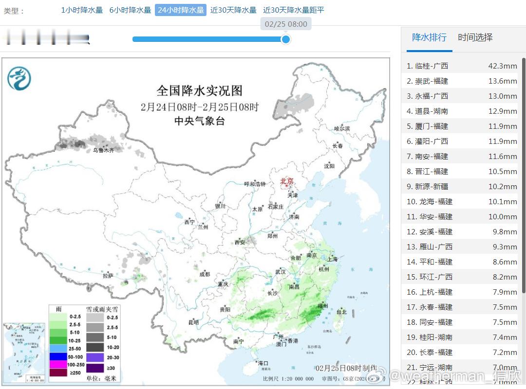【雨雪——两轮降水过程】昨天到今晨,南方出现大范围降雨,但总体的降雨强度减弱,广西临桂出现大雨。新疆天山沿线出现降雪,新源出现暴雪,今晨8时积雪8厘米。此外因为气旋的影响,今晨内蒙古东部也开始下雪。今后7天,冷暖空气都活跃,2月25日-27日,2月28日-3月2日,我国还有两轮大范围降水。