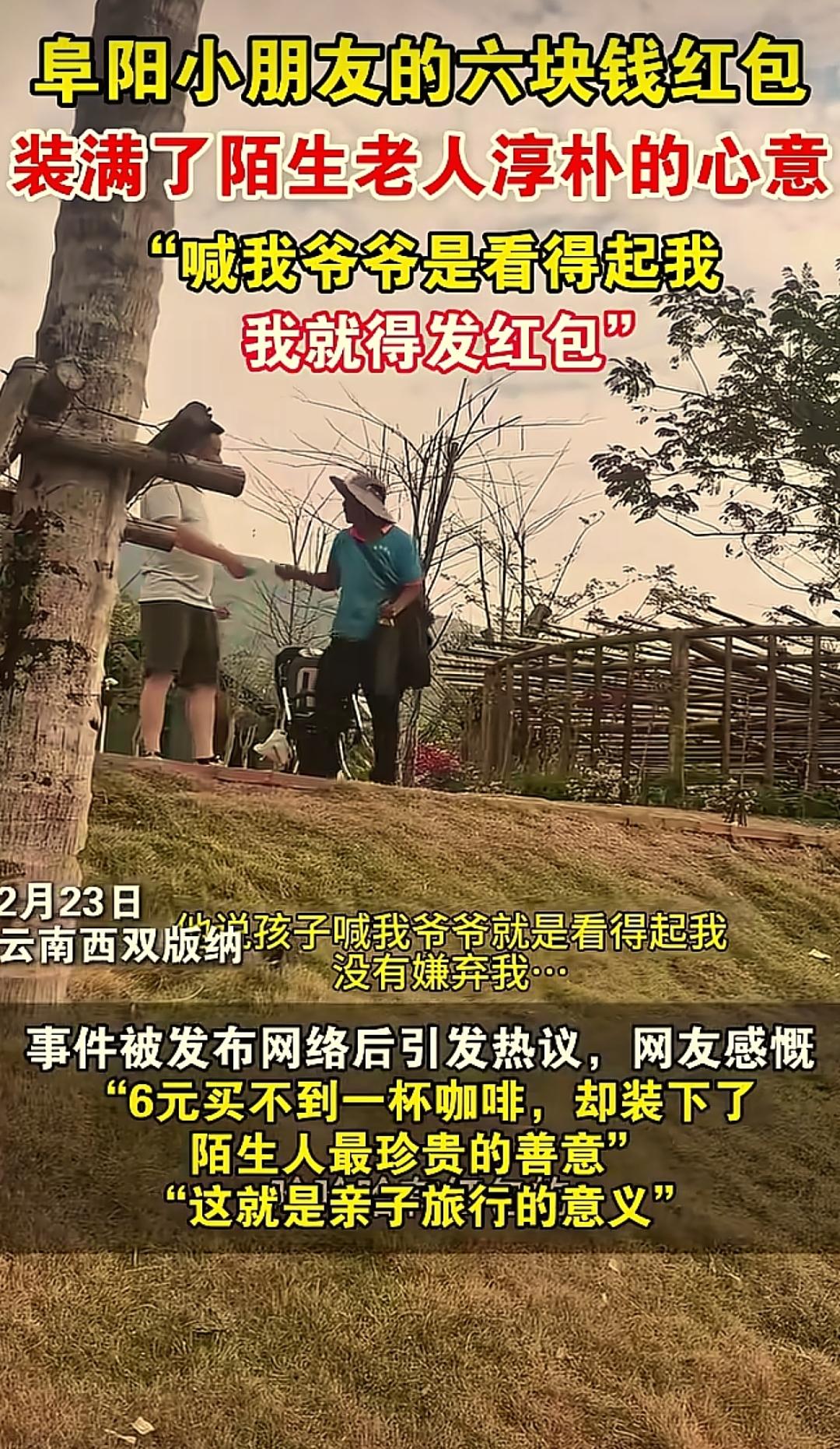 “双向奔赴!”云南西双版纳,女子带着两个孩子在外面散步,看到一位园丁爷爷在给花浇水,孩子就上前打招呼说了句“爷爷好”,没想到,爷爷从兜里掏出6块钱递给孩子,并对女子说::“喊爷爷是看得起我,我就得发红包!” 李女士一家人是安徽阜阳的,过年期间带着孩子到云南旅游,吃完饭后,一家人就在酒店的花园散步,四岁的小儿子虎头虎脑跑在最前面,突然在一个浇花的老人跟前刹住了脚 老人穿着深蓝色工作服,裤腿卷到小腿肚,手里攥着根胶皮水管,正弓着腰给花圃浇水。小儿子仰起脸,脆生生喊了句爷爷好。老人直起身,眯着眼看看孩子,脸上那些沟壑似的皱纹就全化开了 李女士正要跟上去,却见老人在工作服口袋里翻找起来。先是掏出一团揉皱的纸巾,又摸出半包香烟,最后在裤子后兜里掏出几张皱巴巴的纸币 一张五块的,一张一块的,边角都卷起了毛边。老人把两张纸币叠在一起,弯下腰,郑重其事地塞到孩子手心里 夫妻俩追着老人要把钱还回去。老人边退边摆手,脸上全是笑,用方言跟他们说话,夫妻俩很多话都没听明白,但听懂了一句:喊爷爷是看得起我,我就得发红包 说实话,这个事不大,金额也不高,但份量却不小,让人看的心里暖暖的 人与人之间的温度,有时候就藏在这些被我们忽略的瞬间里。一句问候,六块钱,一次抱起,都没有什么了不起。但就是这些小事,让一个外省女人记住了云南,让孩子记住了礼貌的分量,让老人记住了自己被看见的快乐 双向奔赴不一定要惊天动地。它可以是孩子的一句问候,也可以是老人从兜里掏出的六块钱。是你看见我,我也看见你。是你把我当回事,我把你当回事。就这么简单