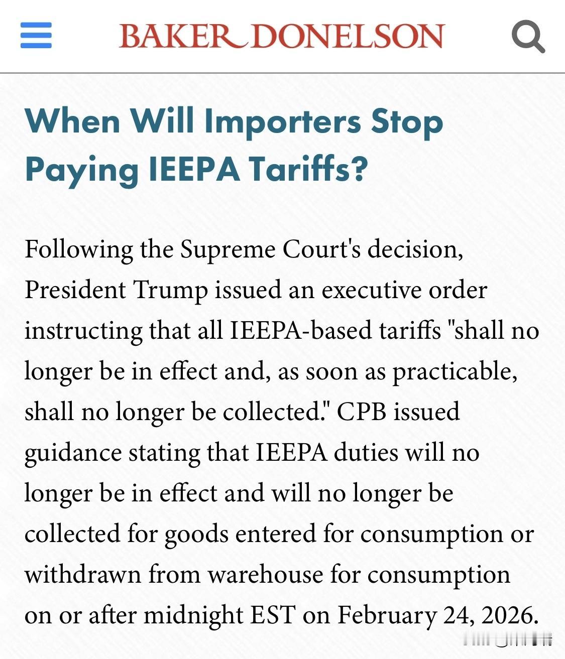 美国海关与边境保护局(CBP)已正式通知,从美国东部时间 2026年2月24日凌晨12:01 起,正式停止征收此前依据《国际紧急经济权力法》(IEEPA)课征的加征关税。 此次政策变动的主要背景如下: 法律裁定:美国最高法院于2026年2月20日作出裁决,认定特朗普政府援引 IEEPA 实施的大规模关税政策违法,理由是该法律未授权总统大规模征收关税。 停止征收范围:CBP 通过货物系统消息服务(CSMS)明确,将停用所有与 IEEPA 相关的关税代码。这主要涉及针对中国、墨西哥、加拿大等国实施的“对等关税”和“芬太尼关税”等。 新关税替代:虽然 IEEPA 关税停收,但特朗普已随即宣布依据《1974年贸易法》第122条,对全球商品加征 15% 的进口关税,作为替代措施。 不受影响的关税:此次停收不影响依据《1962年贸易扩展法》第232条(国家安全)和《1974年贸易法》第301条(不公平贸易)征收的其他关税。 目前,已有包括 FedEx 在内的上千家美国企业向美国国际贸易法院(CIT)提起诉讼,要求退还此前缴纳的违法关税。