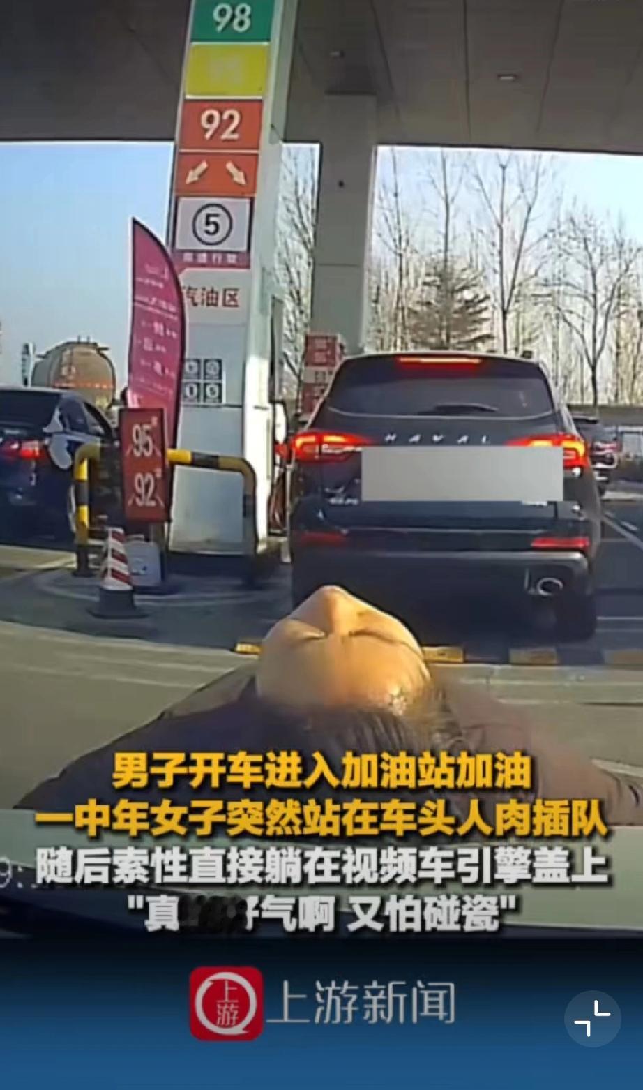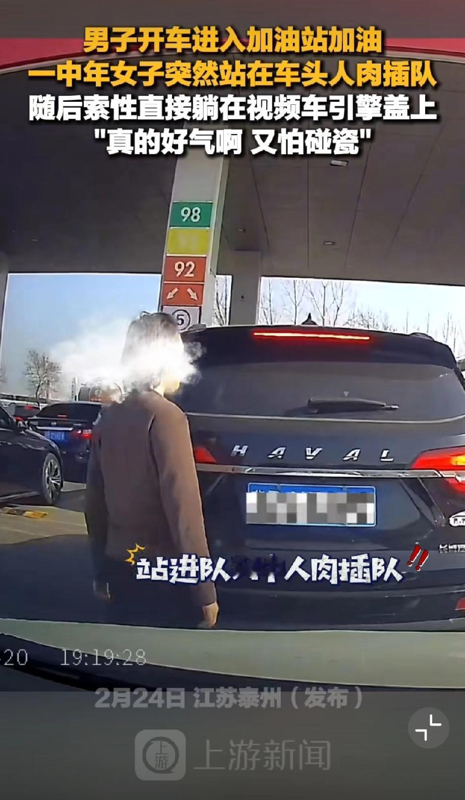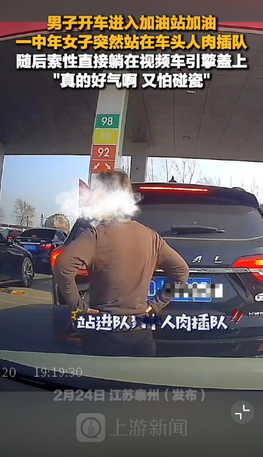 女子在加油站人肉插队躺后车引擎盖。近日江苏泰州一男子开车排队准备加油,突然从一旁走来一名女子,双手叉腰直接挡在男子车前[晕]想要"人肉插队"她甚至一屁股坐在车头,想让自家车辆先加油[what]最后更是直接躺在引擎盖上,直到插队成功才返回车内 男子直言太无语了,她的车后排还有孩子[黑线]当着孩子面,也能做出这种事来。 部分观点认为车主遵循“幸福者退让原则”属明智选择,可避免冲突升级或被反咬讹诈