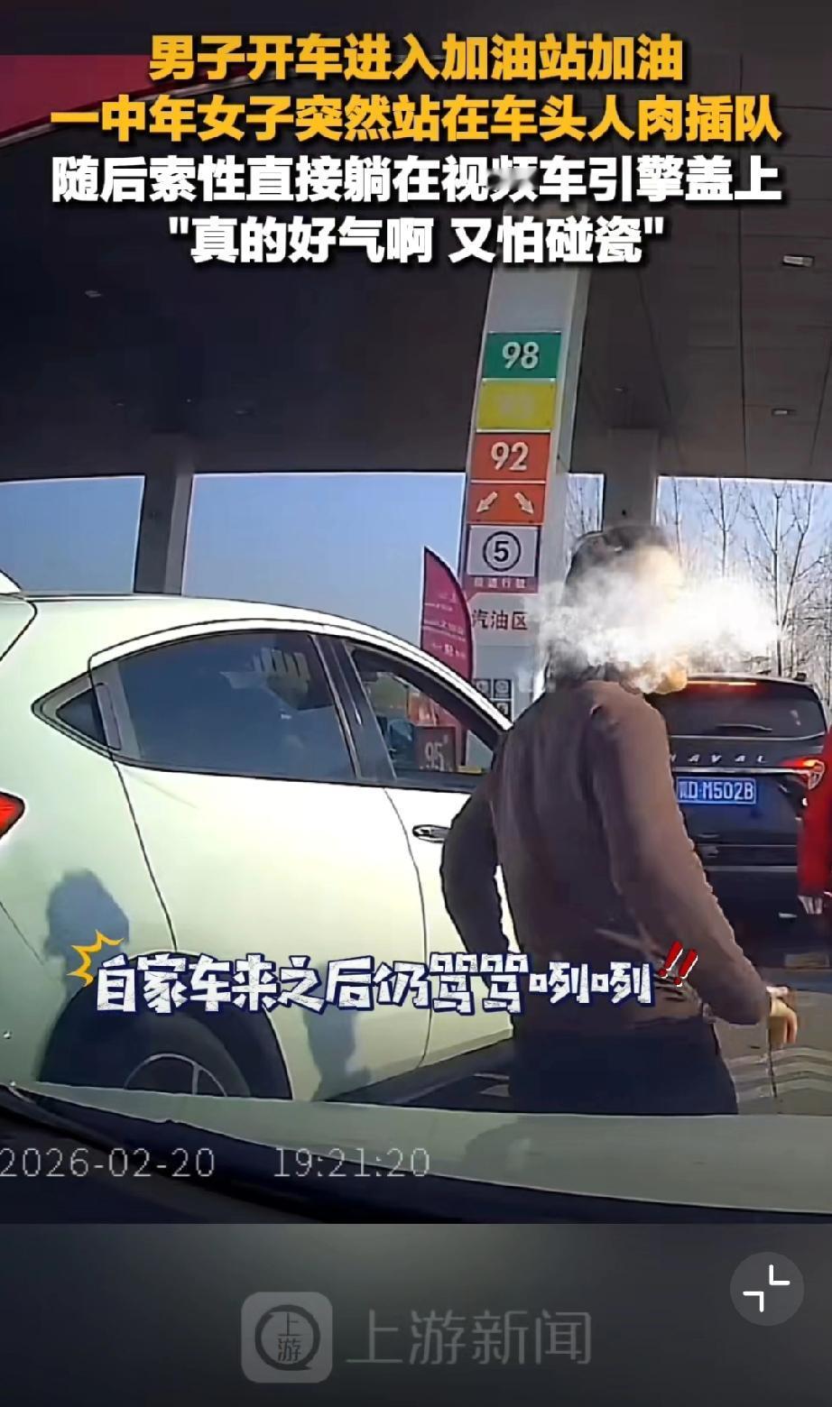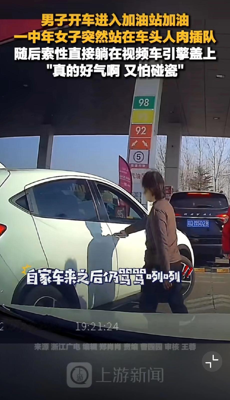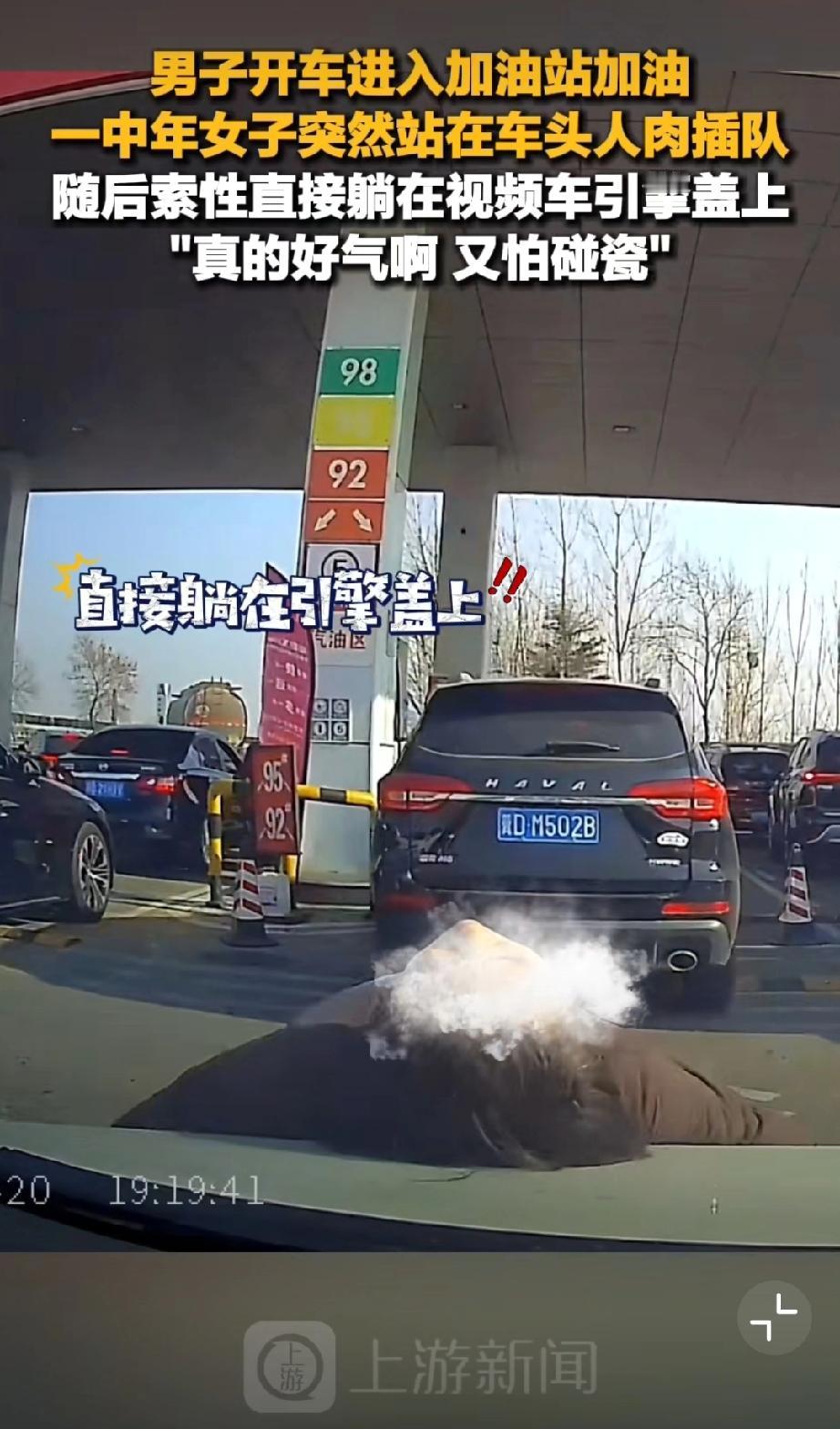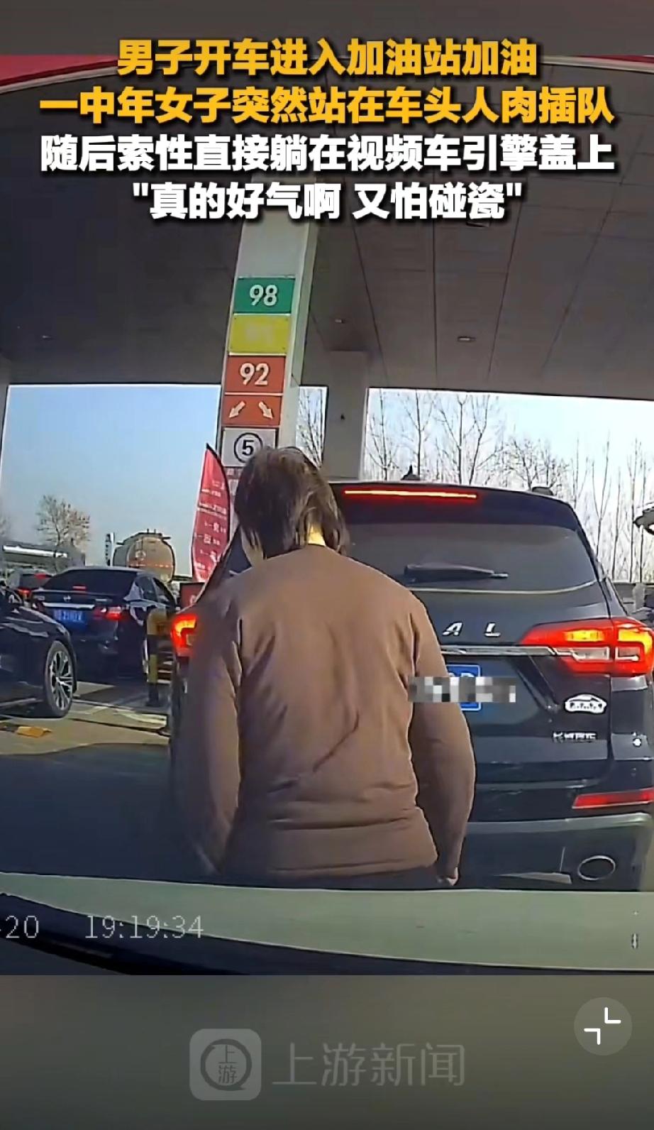 女子在加油站人肉插队躺后车引擎盖。近日江苏泰州一男子开车排队准备加油,突然从一旁走来一名女子,双手叉腰直接挡在男子车前[晕]想要"人肉插队"她甚至一屁股坐在车头,想让自家车辆先加油[what]最后更是直接躺在引擎盖上,直到插队成功才返回车内 男子直言太无语了,她的车后排还有孩子[黑线]当着孩子面,也能做出这种事来。 部分观点认为车主遵循“幸福者退让原则”属明智选择,可避免冲突升级或被反咬讹诈