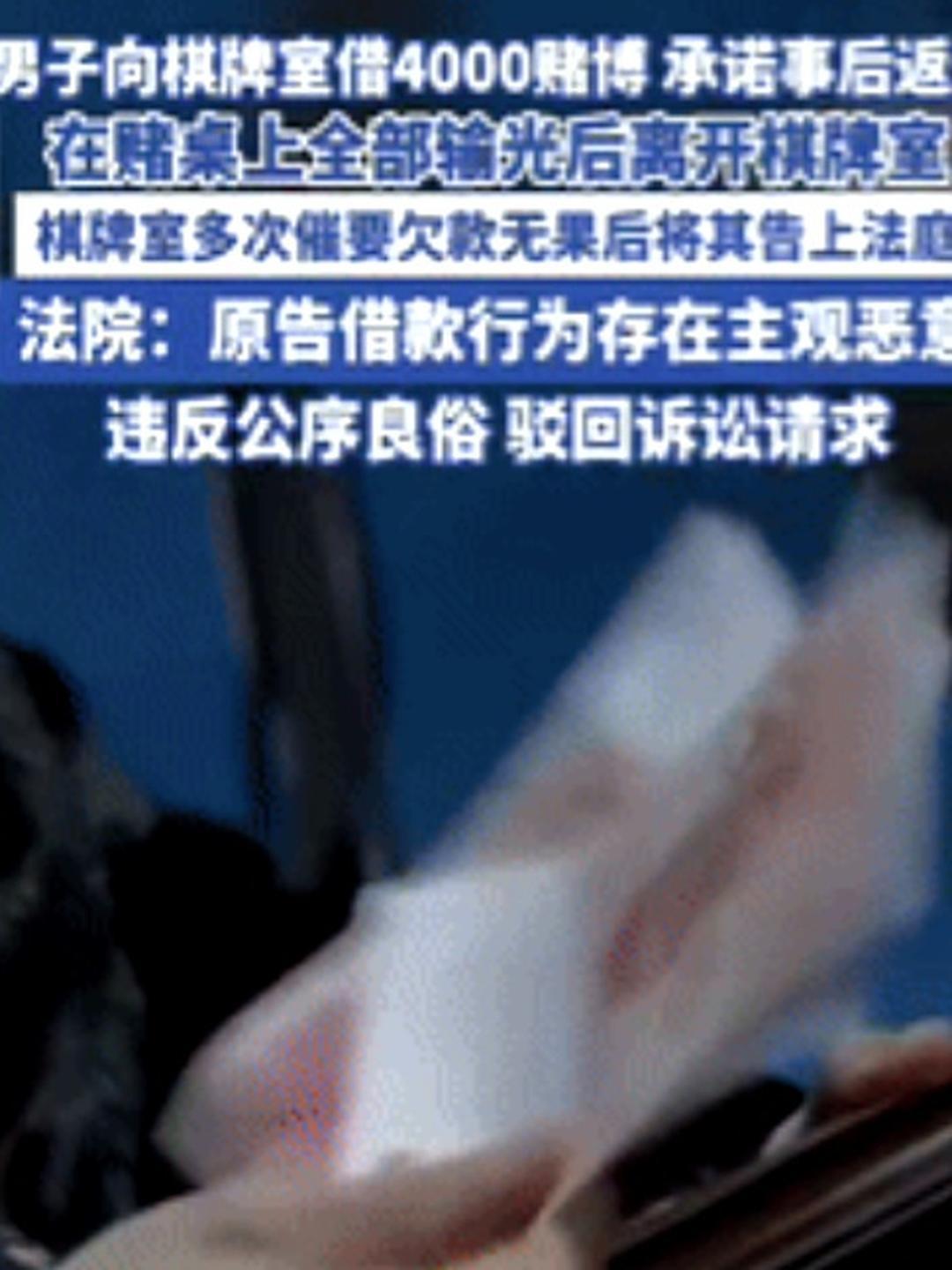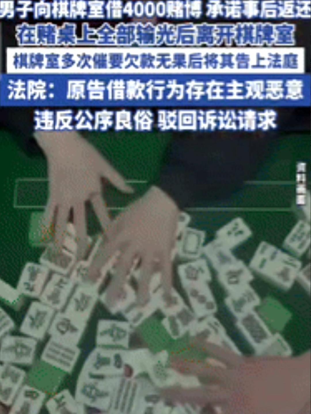 成功白嫖!输光后借4000元继续赌,还不起,借款人起诉被驳回,这钱还能要回来吗? 近日江苏一个棋牌室里,有个男子打牌把本钱都输光了,于是他马上就找老板借了4000块钱接着去赌,可没过几分钟这些钱又被他全输光了,结果男子一声不吭的就走了,也没把钱还给棋牌室老板。 后来,老板好几次催他还钱,但他就是不搭理,老板急了就带着转账记录和聊天截图去法院起诉,想着证据这么全,肯定能要回来。 法院查清楚这笔借款是用来参与赌博的,而且老板明明知道这是赌钱还借出去,这属于支持违法行为,法院按照法律规定认为这个借贷关系没有效力,直接驳回了老板的请求,那个男子一分钱都没有偿还,也没有被追究责任。 很快这件事就在本地传开了,很多人第一次才明白过来,欠下的赌债,其实是不受法律保护的。