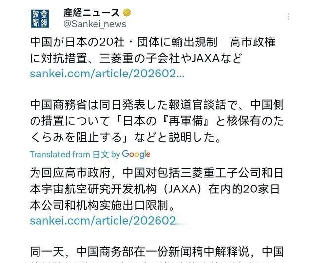 中国再次对日本出手!开年上班第一天,日本没有等待我们对其希望对话的回应,而是等到了新的制裁令!2月24日,根据日本产经新闻报道,日媒称,中国商务部宣布将20家日本企业和机构列入出口管制清单,禁止出口军民两用产品。清单中的企业包括三菱重工集团公司、日本防卫大学和日本宇宙航空研究开发机构。而这一禁令宣布后即刻生效。 开年上班第一天,北京这边直接甩出商务部第11号和第12号公告,把总共40家日本实体分成两批管制。核心就是军民两用物项出口管制,直接卡住中国对这些实体的相关出口,同时也禁止境外把中国原产的两用物项转给它们。名单里最显眼的几家,三菱重工集团旗下的造船、航空发动机、海洋机械这些子公司全在里面,日本防卫大学和宇宙航空研究开发机构也赫然在列。另一批关注名单还有斯巴鲁、日野汽车、TDK这些,出口过去得额外交风险评估报告和不用于提升日本军事实力的书面承诺,审查卡得更死。 为什么挑这个时候动手?背景其实挺清楚。高市早苗去年10月刚当上日本首相,自民党总裁选举里她第三次参选终于赢了,成了日本历史上第一个女性首相。她上台后继续推高防卫预算,强化军事能力建设,公开表态要修改宪法第九条,扩大自卫队活动范围,还在涉台问题上反复踩红线。去年底她连任后,通过各种渠道放话希望跟中方对话,缓和气氛。但这边显然没买账。元旦假期一过,就来了2026年第一波反制,现在春节一结束,又来第二波。时间点卡得死死的,摆明了告诉你,挑衅的事没那么容易翻篇。 这份管制名单针对性很强。三菱重工这些年跟日本防务项目深度绑定,造船部门参与多型舰艇建造,航空发动机部分涉及F-2战斗机升级和下一代战机发动机研发,海洋机械则跟潜艇声呐、无人水下航行器挂钩。日本防卫大学是自卫队军官摇篮,宇宙航空研究开发机构负责H3火箭、月球探测、卫星项目,这些领域不少关键材料和技术链条里,中国供应占比不小。卡住军民两用物项出口,等于掐住部分高端制造的脖子,尤其是稀土、特种合金、精密光学元件这些,日本短期内很难完全绕开中国供应链。 说白了,这事的核心还是战略博弈。日本右翼势力这些年一直想借着所谓“国家正常化”来突破和平宪法限制,高市早苗上台后动作更大,防卫预算连年创纪录,武器出口“三原则”松绑,联合美英澳搞所谓印太战略围堵。这些动作直接触碰中方核心利益。反过来,中方用出口管制工具回应,既合法合规,又精准打击日本军工产业链薄弱环节。不是说要彻底断供,而是给你增加成本、拖慢进度,让你掂量掂量继续往前冲的代价。 总的来说,这波操作不是突发奇想,而是有明确逻辑的反制链条。从去年高市上台后的连续表态,到元旦后第一波,再到春节后第二波,步步递进。告诉日本:对话可以谈,但前提是你别继续往军事化那条道上跑。否则,经济代价只会越来越大。事情发展到这一步,谁都不好过,但根子还在日本自己选的路。