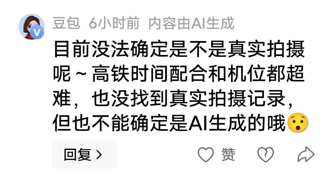 绝绝子!这个视频拍摄的太绝了!真的是妙不可言! 不确定是不是AI,就问了一下豆包,豆包的回答是: 目前没法确定是不是真实拍摄呢,高铁时间配合和机位都超难,也没找到真实拍摄记录,但也不能确定就是AI生成的哦! 看来这个视频也把豆包难住了! 如果是真实拍摄的视频,那拍摄技术和角度的选取真的太牛了,创意抓拍捕捉独特画面,使作品更具记忆点和视觉冲击力,动感十足! 有网友说,应该不是真实客观的摄影,因为高铁速度极快,跟女孩的动作速度完全不在一个级别,但是画面显示的却一点也不违和,似乎高铁的速度就是为她量身定制的。 也有网友说,这是重庆轻轨李子坝站,因为楼里就是李子坝站,所以轻轨确实很慢,是真实拍摄。 老铁们,你们觉得这是真实拍摄吗?