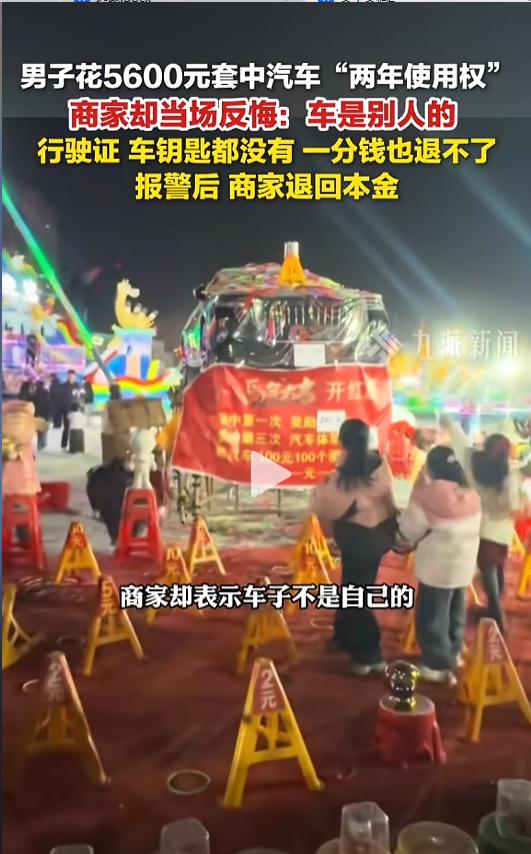 “脸都不要了!”近日,山东济宁,一男子看见套圈店上有套汽车活动,顿时心动不已。商家写着套中三次给二年汽车使用权。心动之下,男子花费5600元,终于套中了三次,可没想到这时候商家却反悔了,男子气愤之下报了警!网友:做生意得讲诚信! 据媒体2月23日报道,事发当日男子在路边看到了一个套圈店,里面有套汽车的活动。只见一辆红旗车被用钢管架了起来,车头还还贴着宣传布,写着“马年大吉开红旗!” 男子仔细看了看规则,上面写着套中一次奖288元,套中三次奖汽车使用权二年,一元一个圈。 男子心动了,豪掷千金,最终花费5600元终于套中了三次。等男子欢欢喜喜去兑奖的时候,却被商家泼了一盆冷水。 商家表示,“车是别人的,行驶证也没有,车钥匙也没有,钱一分也退不了”。男子见协商不成,一气之下报了警! 在警方的介入下,商家改了口,最终退还了套圈的本金。谁能想到,就是玩个套圈,最后还得靠警察才能了事。 网友看后表示,做生意最重要的就是讲诚信,既然贴出来了就要执行。既不讲诚信,态度还这么狂,以后还有谁会来玩?还有人表示,单单退回本金,太便宜商家了,他这是欺诈,得去举报他! 信息来源:《2月23日报道,山东济宁,男子花5600元套中汽车使用权商家反悔 : 车是别人的,行驶证、车钥匙都没有,一分钱也退不了。报警后,商家退回本金。》九派新闻