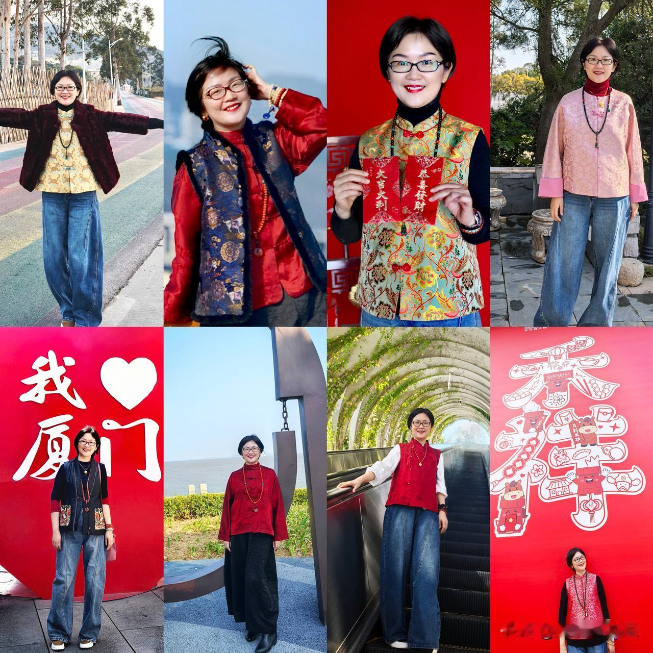 52岁,过年8天不重样穿搭的生活态度: 除夕:穿件虎震五毒的宋锦新中式马甲+酒红色小貂外套在海门岛的🌈路告别2025迎接2026的五彩人生。 大年初一:穿件马上有福的深蓝色宋锦新中式棉马甲迎接马年,愿我的2026平安有福。 初二:穿件流光溢彩的宋锦天鹅湖新中式马甲回娘家纳财纳福,老人长辈特别喜欢这种喜气洋洋的调调。 大年初三:穿件粉色宝相花宋锦外套在家泡茶躺平。 大年初四:穿件香云纱黑龟的刺绣马甲,在中山路上溜溜达达吃吃逛逛,家门口的风景。 大年初五:穿件红色的香云纱皮子新中式外套,在漳州港边走亲戚,边眺望厦门吹吹海风。 大年初六:穿件红色的花萝马甲,在万石植物园置身花草间感受春天。 大年初七:穿红色宝相花的宋锦马甲,在生活气息浓郁文艺的禾祥西闲逛,家门口的这条路,没事就逛逛,百逛不腻。 年年岁岁,我似乎都有一个很固执的坚持,过年一定要穿新衣,且过年一定要穿喜庆的红衣服,哪怕年过50,也要把自己像孩子一样对待,过年也要有过年的态度,仪式感要有,喜庆的寓意要强,毕竟新年新气象,新衣又自带新能量,怎么能不给自己准备几套新衣服呢? 过年8天假期不重样的穿衣态度,不仅是我外在的风格表达,更是我对生活一点不含糊一点不将就的态度,时时刻刻取悦自己,这一点很重要。 新的一年,每天把自己捯饬清楚,狠狠美丽,再出发!