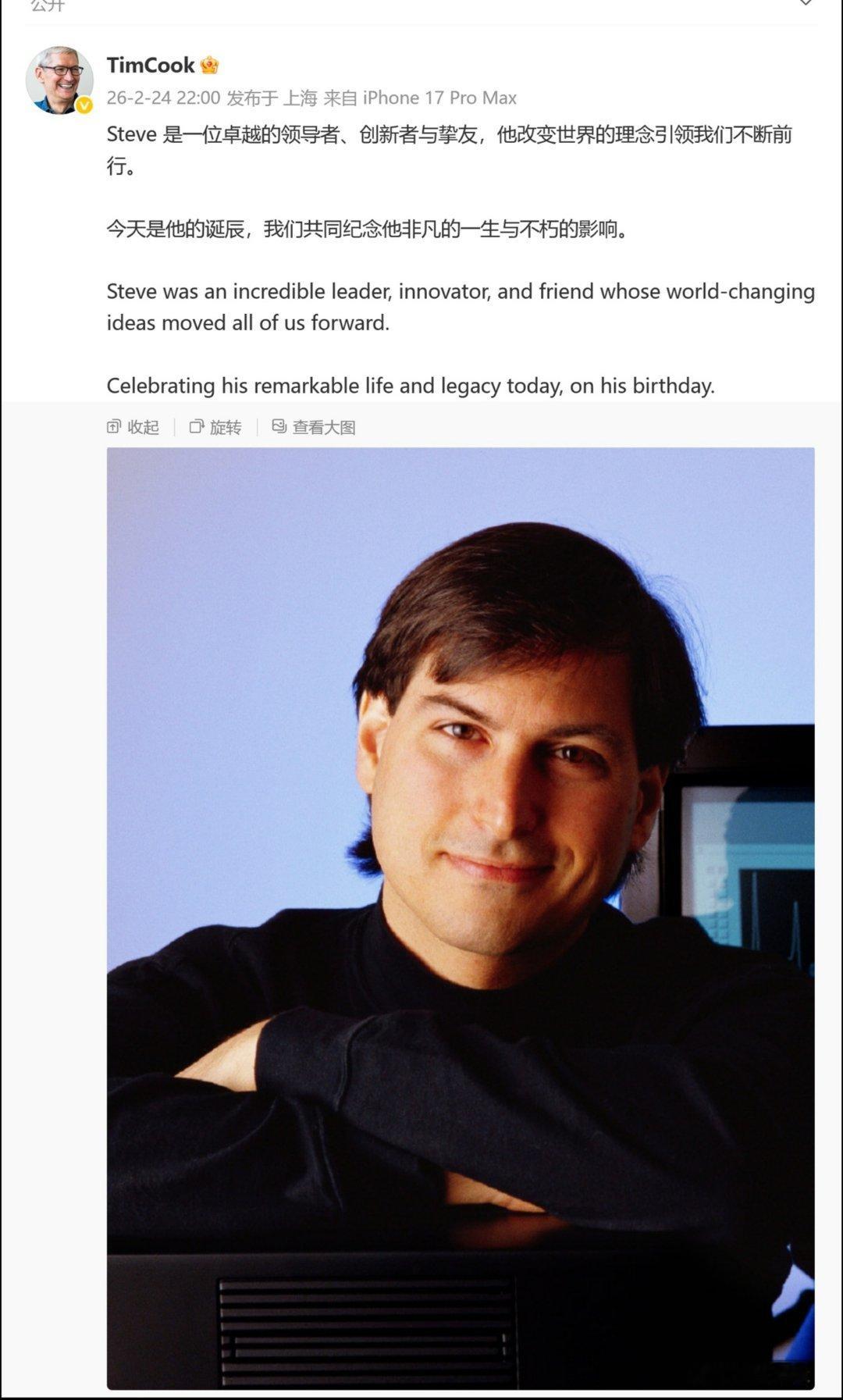 苹果首席执行官蒂姆 · 库克昨日在 X 和微博平台发布动态,纪念美国苹果公司联合创始人史蒂夫 · 乔布斯诞辰 71 周年。