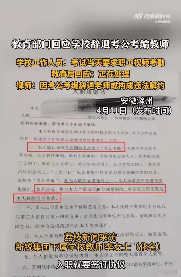 教育局回应教师报考其他单位遭开除这件事很多人没看到问题的关键,这件事的焦点是学校与老师签订的劳动合同中“禁考条款”是否合法,劳动法明文规定:除专项培训服务期、保密、竞业限制外,用人单位不得随意限制员工合法择业与报考权利。而这个老师都不在这几项限制之内,显然学校劳动合同中“禁考条款”是违反劳动法的。