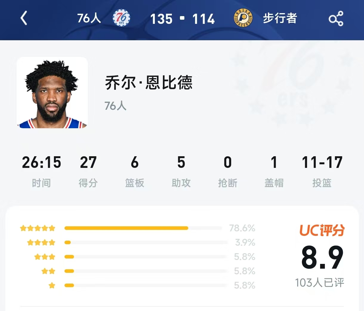🎬 原始评分截图(文字版) 乔尔·恩比德 | 76人 时间 26:15 | 得分 27 | 篮板 6 | 助攻 5 | 抢断 0 | 盖帽 1 投篮 11-17 ⭐⭐⭐⭐⭐ 78.6% | ⭐⭐⭐☆ 3.9% | ⭐⭐☆☆ 5.8% | ⭐☆☆☆☆ 5.8% UC评分 8.9 | 103人已评