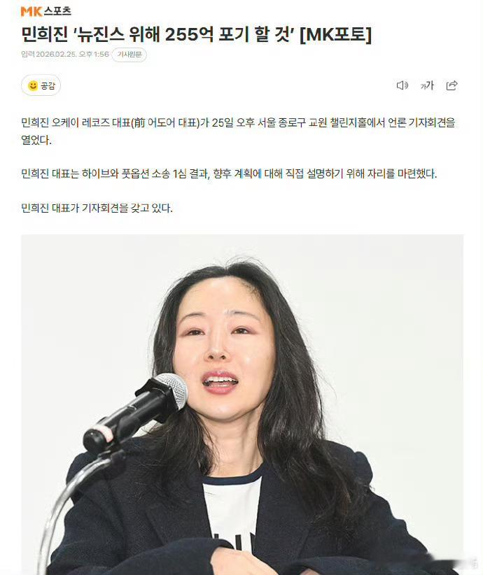 闵熙珍放弃255亿赔偿闵熙珍放弃255亿韩元赔偿 闵熙珍在今日的记者会上提出放弃她获得的255亿韩元赔偿(之前hybe被判向她支付这个金额),希望HYBE可以解除NewJeans的合约,并撤销对NewJeans粉丝以及相关人员的诉讼。 春节刷到宝了