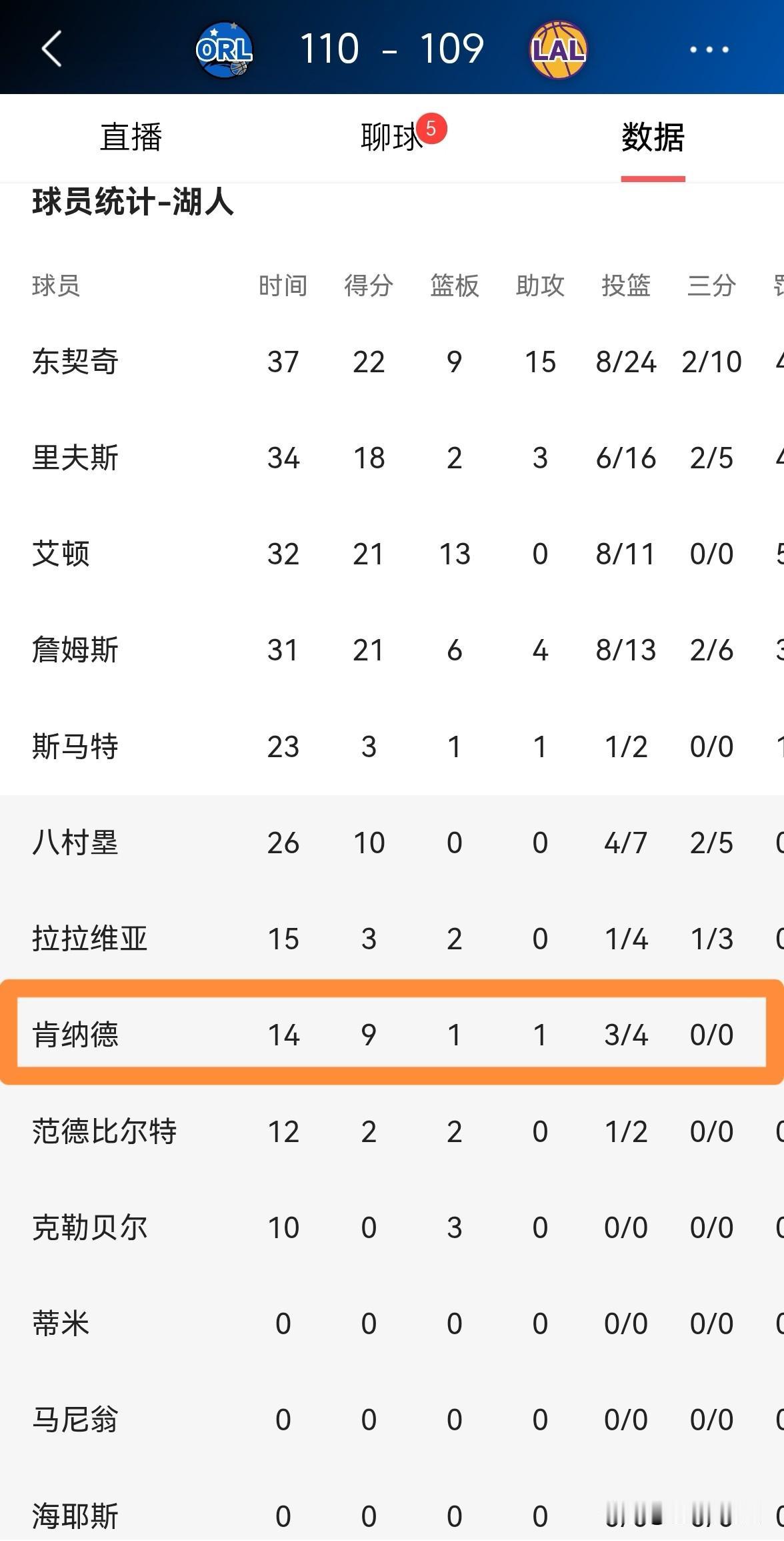我忍不住要怒斥湖人主帅雷迪克!虽然今天湖人在主场以109:110惜败于魔术,但是肯纳德依然延续了自己的出色手感,他在替补出战的14分钟里,投篮4中3,其中罚球4中3非常高效的得到9分,没有出现任何的失误和犯规,他的场上正负值为+1。 最让我感到气愤的是,雷迪克教练在肯纳德状态如此出色的情况下竟然只给了后者14分钟的上场时间,难道雷迪克教练的用人策略真的正确吗?