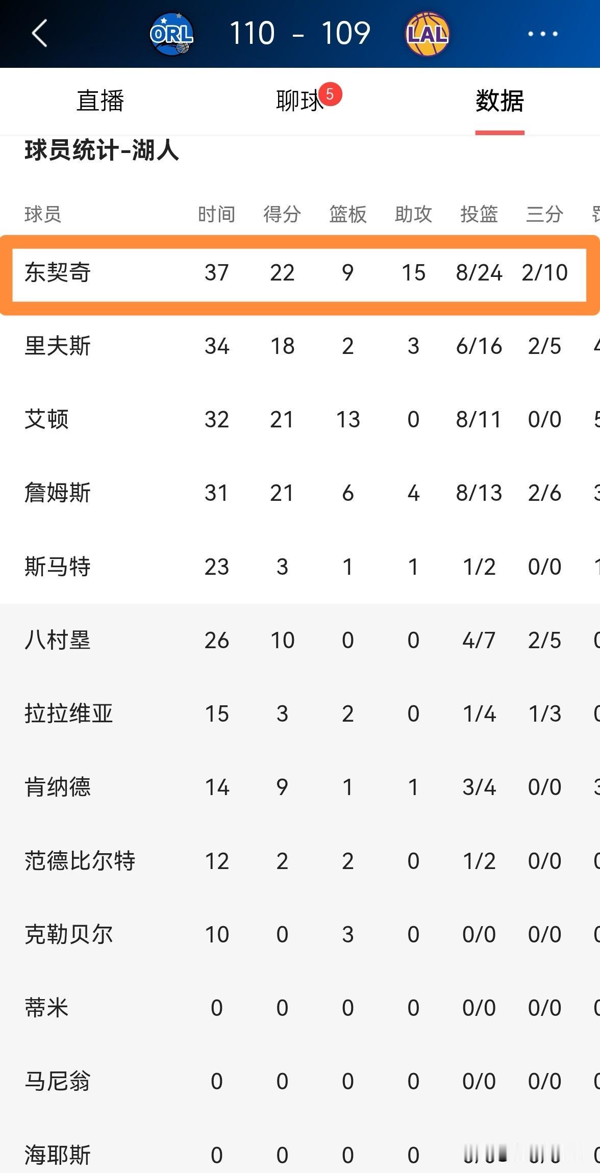 我对湖人巨星东契奇真是失望到了极点!在今天湖人主场以109:110惜败于魔术的比赛中,东契奇的整体表现极其的糟糕,尤其是在比赛的最后时刻,东契奇在获得了一次绝佳的大空位出手的时候却犹豫不决,导致球队遗憾落败。 全场比赛下来,东契奇首发出战37分钟,投篮24中8,其中三分球10中2、罚球9中4非常低效的得到22分,还出现了2次失误和3次犯规。 作为湖人的第一进攻核心,本场比赛东契奇在关键时刻的表现真是让人失望至极,试问这样的球员如何带领湖人夺冠?