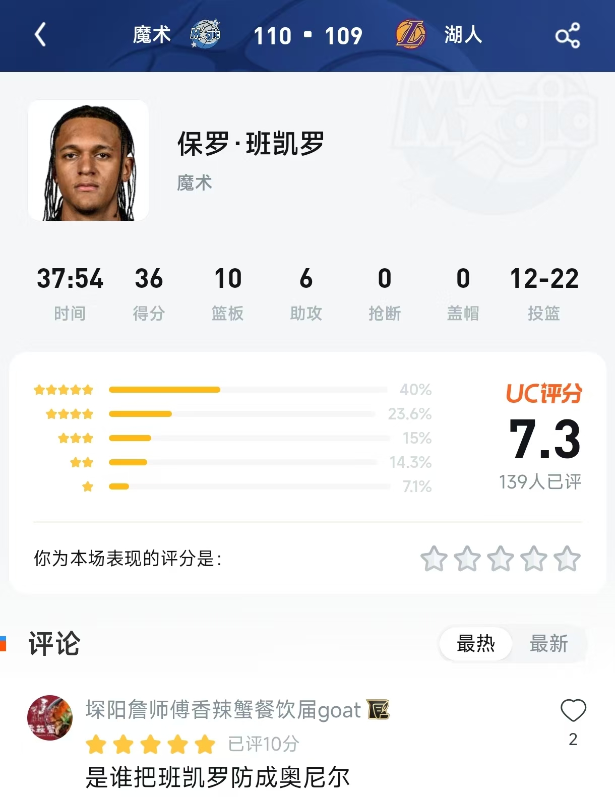 就在刚刚结束的NBA常规赛中,奥兰多魔术客场以110-109一分险胜洛杉矶湖人 。全场最佳毫无疑问是保罗·班凯罗,他出战38分钟,爆砍36分10篮板6助攻的豪华两双数据 。然而,当我们把目光投向赛后的UC评分区,却发现了一件有趣的事。
