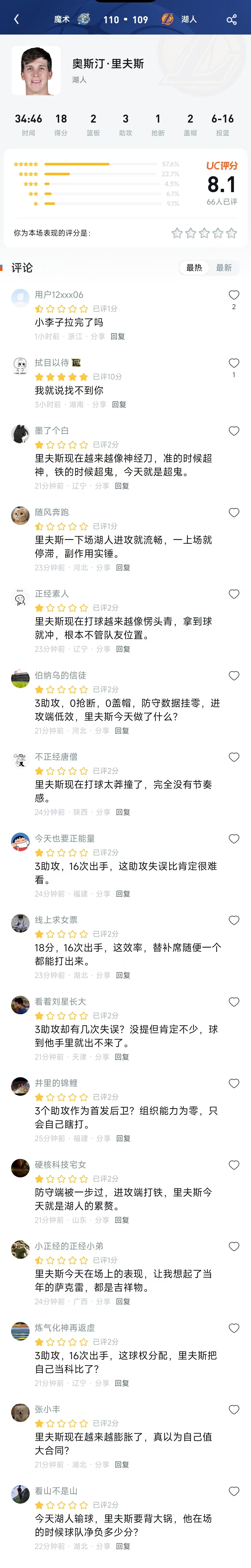 在刚刚结束的这场NBA常规赛焦点战中,洛杉矶湖人主场以109-110惜败奥兰多魔术,遭遇两连败 。尽管“东眉组合”(东契奇22分9篮板15助攻,艾顿21分14篮板)和老詹(21分6篮板)合力砍下64分,但球队依然吞下了失利的苦果 。 赛后,拿到18分2篮板3助攻的奥斯汀·里夫斯成为了舆论的漩涡中心,他的UC评分区彻底沦为了战场。