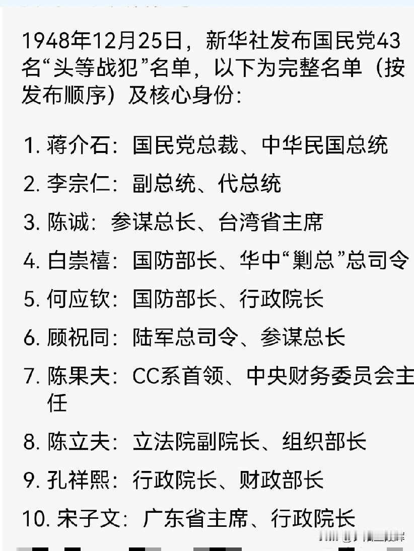 新华社1948年12月25日公布了43名头等战犯名单。 前10名战犯中,属于军事