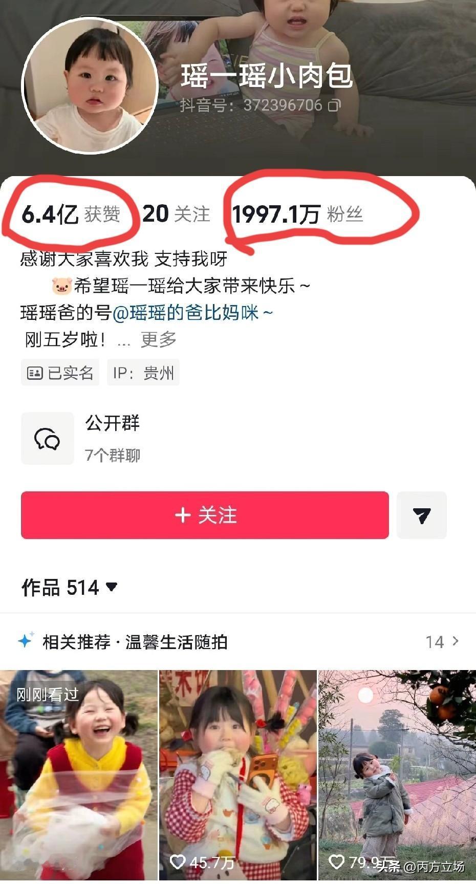 贵州真正流量大网红,估计不少人没听说过,是一个5岁小女孩。来自贵州铜仁,她的视频点赞量基本上都是以几十万、几百万计算。粉丝也不少,接近2000万。总获赞6.4亿,牛。即使不带货,就靠流量变现,收入都会很可观了。 (图片来源于网络) 瑶一瑶小肉包 瑶一瑶小肉包 4岁小网红 走红的小女孩