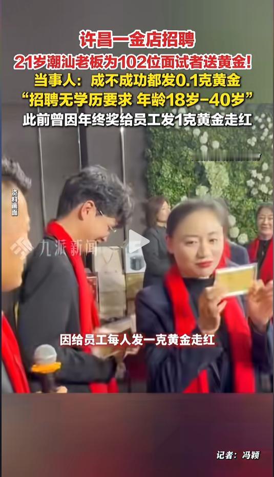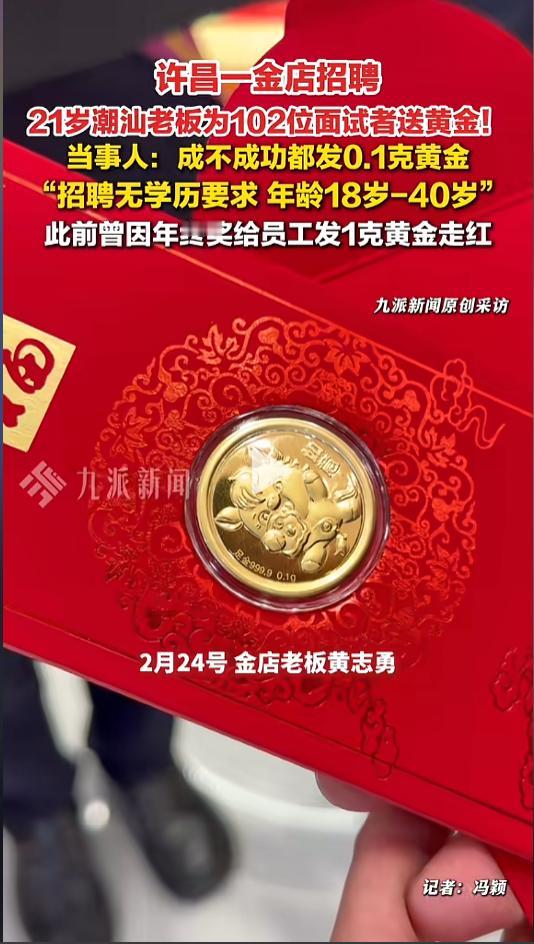 “活该他发财!”近日,河南许昌,一位年轻的金店老板火了。该老板计划开个二店,准备招录60名员工,没想到来面试的人到了一百多。老板也很大气,不管面试成没成功,给每一个来面试的人都送了0.1克黄金的红包。网友:这老板有格局! 最近一段时间,黄金价格飞涨,部分首饰价格甚至突破两千元大关。在这种情况下,还能有老板给员工送黄金,就更加显得难能可贵。 据媒体2月24日报道,该老板是潮汕人,这已经不是他第一次发黄金了。前一段时间,他就曾因给员工发一克黄金当年终奖在网络上走红。 最近,他准备再开一个二店,预计要招收60名员工,并给每个人都准备了一个0.1克黄金的红包。没想到,他竟然收到了一千多份简历,最后来面试的达到了102人。 这老板也很大气,不管面试成不成功,每个人都给了一个红包,还送上了新年祝福。每个人都没白来。 他坦言,“我的员工很多都是宝妈,这样也能给她们减少些压力。我也希望能给更多宝妈提供工作岗位”“有舍才有得,用心对员工,真心对顾客!” 网友看后表示:这才是真正当老板的样子。老板心里装着员工,员工才会死心塌地的跟着老板干,不像有些人只知道压榨。有这样的生意理念,迟早会发大财! 信息来源:《2月24日,河南许昌,