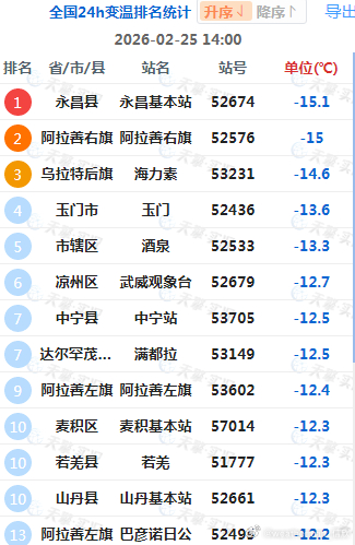 【气温波动】今天北方地区气温,东升西降。因为冷空气影响,甘肃西部、宁夏、内蒙古西部一带,出现10-15℃降温。甘肃永昌降15.1℃、内蒙古阿拉善右旗降15℃、宁夏中宁降12.5℃,为各自省区14时降温最强站点。