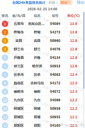 今天在冷空气到来前,内蒙古东部和东北三省多地,气温明显回升。黑龙江龙凤山升13.9℃、吉林桦甸升13.6℃、内蒙古开鲁升12.6℃,为各自省区14时升温最强站点。哈尔滨也猛升12.6℃。
