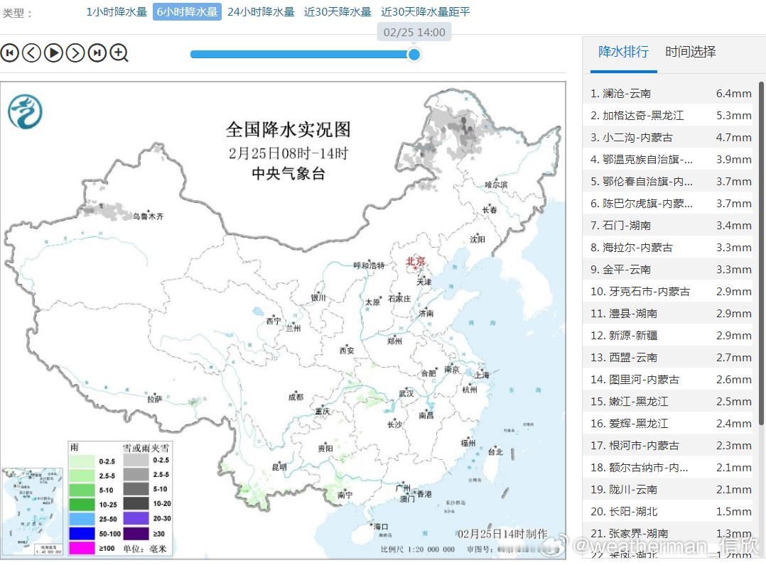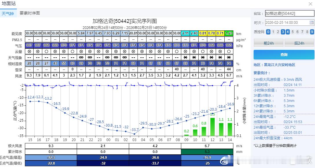 【降水】今天08-14时,内蒙古东部和黑龙江西部一带,受到气旋影响,降雪增多。地理位置在内蒙古、行政属于黑龙江的加格达奇,6小时降雪量5.3毫米,至少已经是大雪。积雪从早晨的40厘米增厚到44厘米,改写了2月最深积雪纪录,距离观测史纪录46厘米(2004-03-10),也不远了。