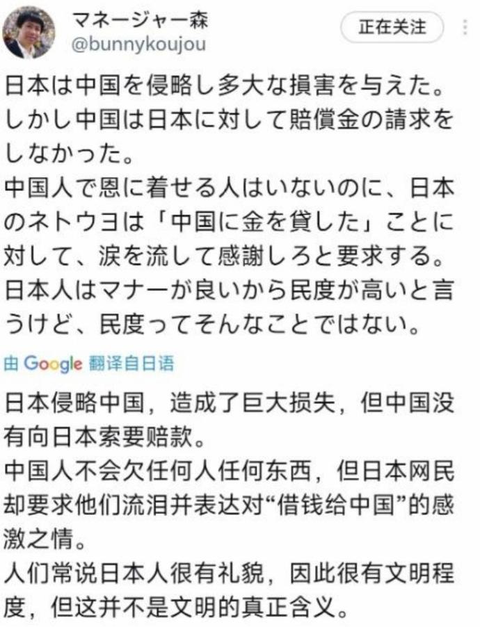 有日本人发文称,日本侵略中国,给中国造成了巨大损失,但中国没有向日本索要赔款,如今日本却要在台湾问题上“倒打一耙”,人们常说日本人有礼貌,可这番做法,显然失去了文明的真正含义。 日本当年侵略中国,造成的损失触目惊心,山河破碎、白骨累累,那是刻在民族骨子里的伤痛。可中国为了中日两国人民的长远未来,在 1972 年签署《中日联合声明》时,主动放弃了对日本的战争赔偿。这本是仁至义尽的善意,是大国的胸怀与格局,没想到如今却被某些人当成了软弱的借口,甚至在台湾问题上倒打一耙,把文明的底线踩得稀碎。 别以为日本人的 “礼貌” 是天生的,那更多是一种刻在社交规则里的教养,和对历史的敬畏、对恩情的尊重从来都两码事。可现在的情况很明显,这份所谓的 “礼貌”,在利益面前不堪一击,在野心面前荡然无存。他们选择性遗忘了当年的侵略罪行,反而把中国的退让当作了可以肆意践踏的资本。 我们得先把话说透,中国当年放弃赔偿,绝不是一时冲动,更不是什么 “不计较”。那是深思熟虑后的战略抉择。当时的国际环境错综复杂,冷战的阴云笼罩,中国面临着复杂的外部压力。 做出这个决定,一方面是为了打破外部封锁,推动中日邦交正常化,打开外交新局面;另一方面,也是不想让这份赔偿,最终转嫁到无辜的日本普通民众身上,毕竟战争的罪责,不该由百姓来买单。这份格局,是着眼于世代友好的远见,是超越恩怨的理性。 但善意从来不是单向的,更不是理所当然的。日本本该借着这份善意,深刻反省历史,珍惜和平,与中国相向而行。可现实呢?他们不仅没有感恩,反而走上了一条背道而驰的路。尤其是近年来,在台湾问题上,日本的小动作层出不穷,简直让人眼花缭乱。 他们政客的嘴皮子就像没把门的,一会儿喊 “台湾有事就是日本有事”,一会儿又炒作所谓 “撤侨”“安保”,把台湾问题硬生生往自己的势力范围里拽。更过分的是,他们居然还想在法律层面搞小动作,试图篡改在台民众的户籍信息,妄图制造 “一中一台” 的既成事实。 这种行径,根本不是什么 “关心地区安全”,纯粹是干涉中国内政,是在历史的伤疤上反复撒盐。要知道,台湾是中国不可分割的一部分,这是铁一般的事实,也是国际社会公认的原则,日本作为当年的侵略国,没有资格指手画脚。 更让人警惕的是,日本的军事动作越来越大。防卫预算一年比一年高,都快突破 GDP 的 2% 了,各种先进武器装备紧锣密鼓地研发、采购,还频频和美国搞联合军演,演习科目直指夺岛、突击,矛头对准谁,一目了然。这种一边喊着 “和平”,一边扩军备战,在台湾问题上煽风点火的做法,本质上就是在玩火,是在破坏地区的和平稳定。 中国从来不是好惹的,我们的善意有温度,但捍卫主权的决心更有硬度。面对日本的频频挑衅,中国的回应直接而有力。商务部出手,对 20 家核心军工企业实施严格的出口管制,卡住了他们供应链的咽喉。 大家都知道,日本的高端制造,命脉就捏在稀土等关键材料手里,一旦断供,他们的导弹造不出来,军舰动不起来,经济也得跟着受重创。这不是威胁,这是正当防卫,是告诉日本:中国的底线,不容触碰;中国的尊严,不容冒犯。 那个网上发帖的日本人,之所以能引起共鸣,就是因为他看清了这种反差。日本人的礼貌,是对外的体面,却不是对内的良知。 他们可以对客人彬彬有礼,却可以对曾经的受害者倒打一耙。真正的文明,不是表面上的客客气气,而是骨子里的知耻后勇、知恩图报。你对我好,我加倍回馈;你若敢犯我,我必让你付出代价。 所以,别再拿什么 “礼貌” 来粉饰野心了。中国放弃赔偿,是格局,不是软弱;日本干涉台海,是野心,不是正义。 历史的账不能忘,现实的账更要算清楚。台湾问题是中国的内政,绝不容许外部势力插手。日本如果执迷不悟,继续在错误的道路上狂奔,那就要做好承担一切后果的准备。我们不惹事,但绝不怕事,谁想在中国家门口搞事情,谁就必将自食恶果。
