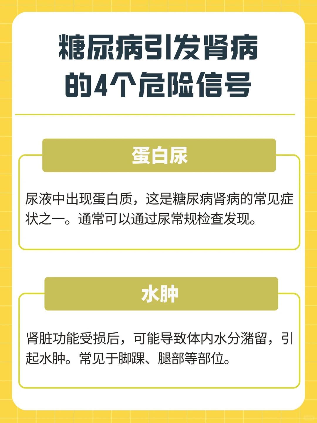糖尿病肾病的四个危险信号,一定要留意! 1、血压升高 糖尿病肾病患者常伴随血压偏高,这多是肾脏功能受损、血压调节能力下降所引起的。 2、贫血表现 肾脏负责分泌促红细胞生成素,当肾功能受损,该物质分泌减少,就可能引发贫血。 3、蛋白尿异常 尿液中出现蛋白,是糖尿病肾病较为典型的信号之一,通过尿常规检查即可及时发现。 4、身体水肿 肾脏代谢功能下降,体内水分无法正常排出,容易造成水液潴留,常见于脚踝、下肢等部位出现水肿。