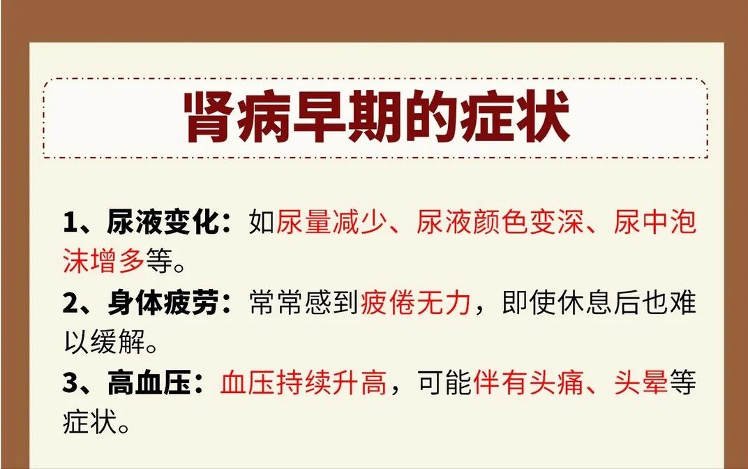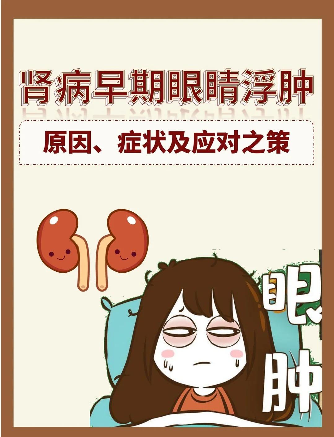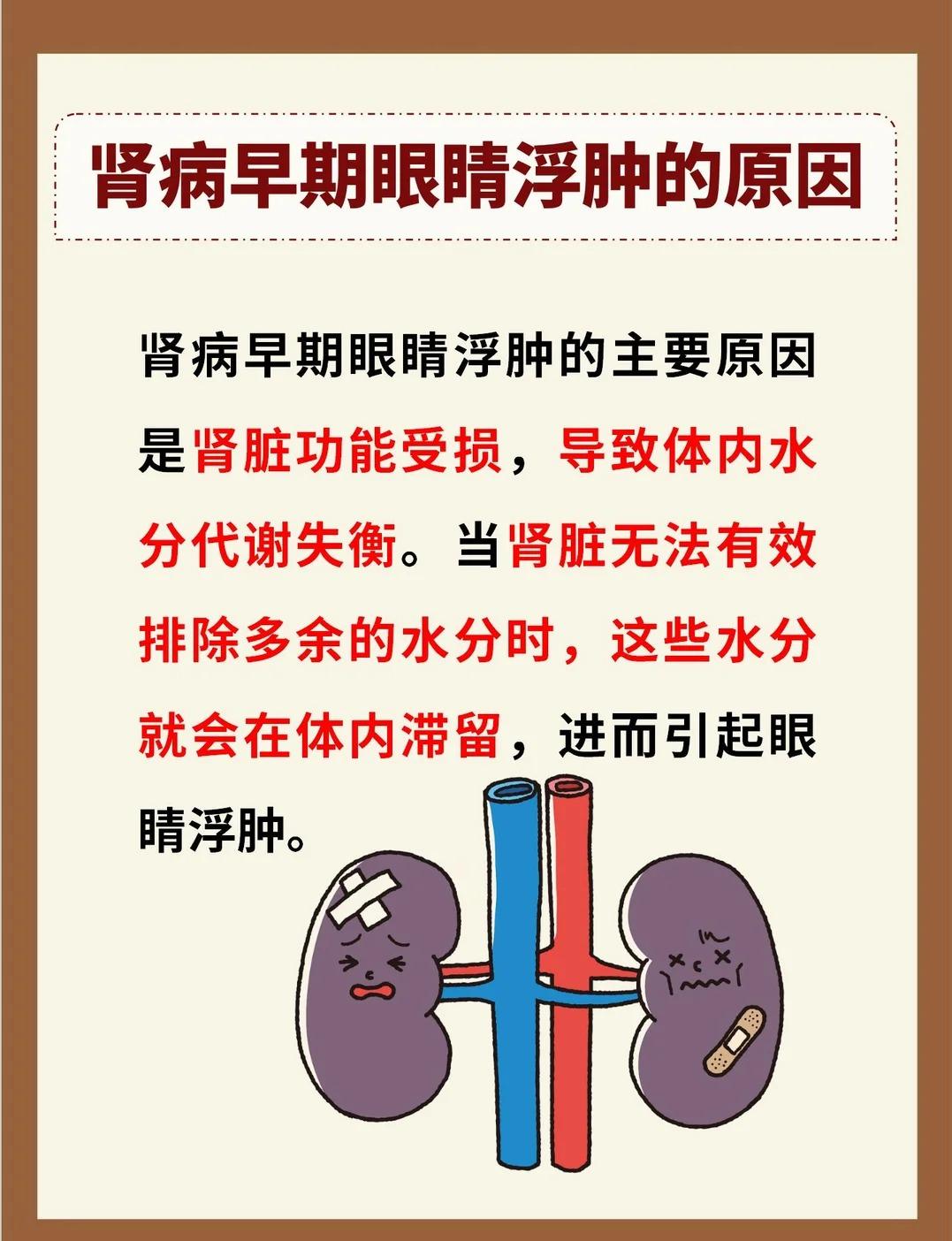 肾病早期为什么会出现眼睛浮肿? 肾病早期出现眼睛浮肿,主要是因为肾脏功能下降,体内水分代谢失衡。当肾脏不能正常排出多余水分时,水分会在体内积聚,而眼睑部位组织疏松,就容易最先出现浮肿。 肾病早期常见信号: 1、尿液异常 尿量减少、尿液颜色加深、尿中泡沫增多且长时间不消散。 2、容易疲劳 经常感到疲惫乏力,即使经过休息也难以明显缓解。 3、血压偏高 血压持续升高,可能伴随头痛、头晕等不适。