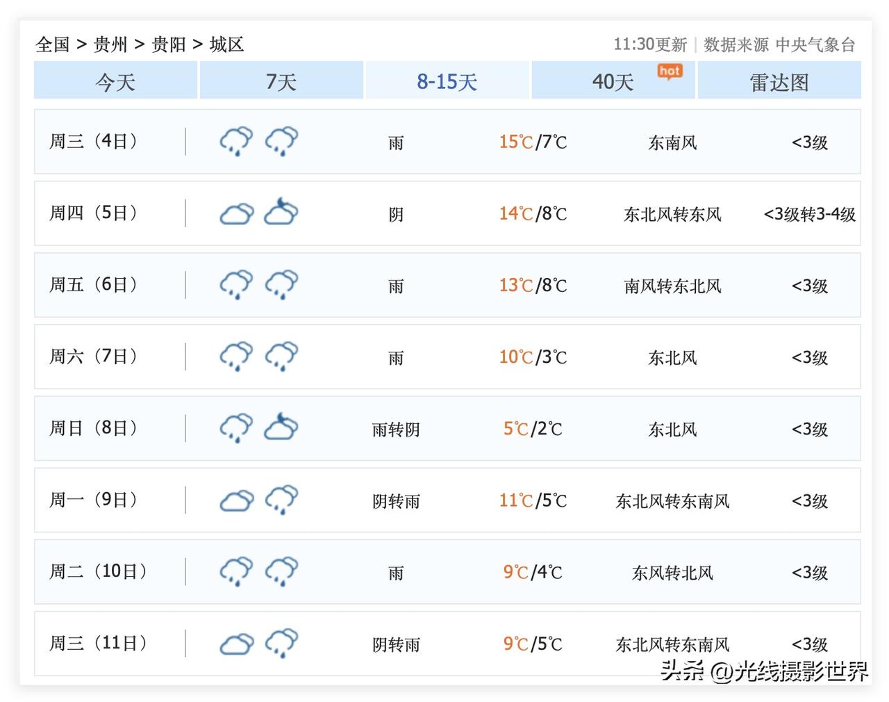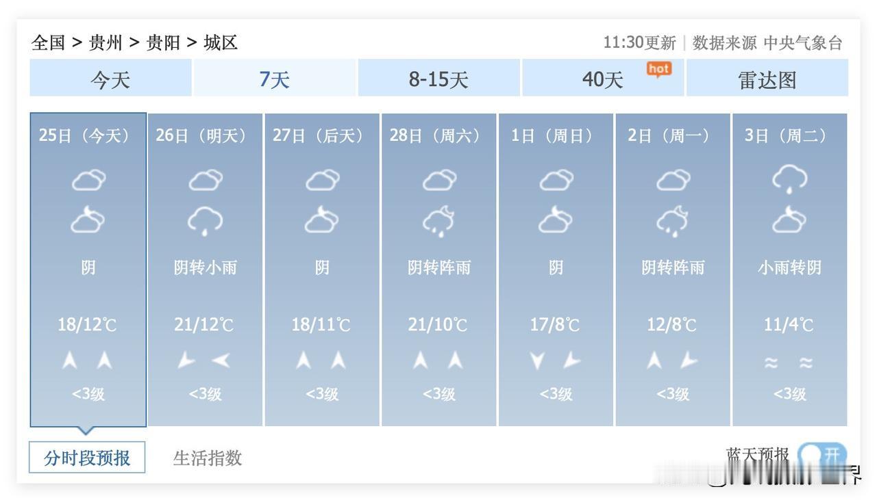简直不敢相信!2月25日到3月11日,贵州省贵阳市,几乎每天都是阴雨天,几乎没有一天会出大太阳啊!啊啊啊!贵阳的名字,真的是名副其实啊! 3月3日,元宵节,贵阳小雨转阴,气温11-4度……你说冷不冷呢?!你说要不要穿秋衣秋裤呢?! …… 3月8日,三八妇女节当天,贵阳雨转阴,气温5-2度,你说会不会冻死不穿厚衣服的单身狗呢?! …… 3月11日,贵阳阴转雨,气温9-5度。 …… 好吧,贵阳平坝农场樱花,估计是3月20日以后盛开了吧?!花溪十里河滩,桃红柳绿,估计是3月中旬以后了吧?!