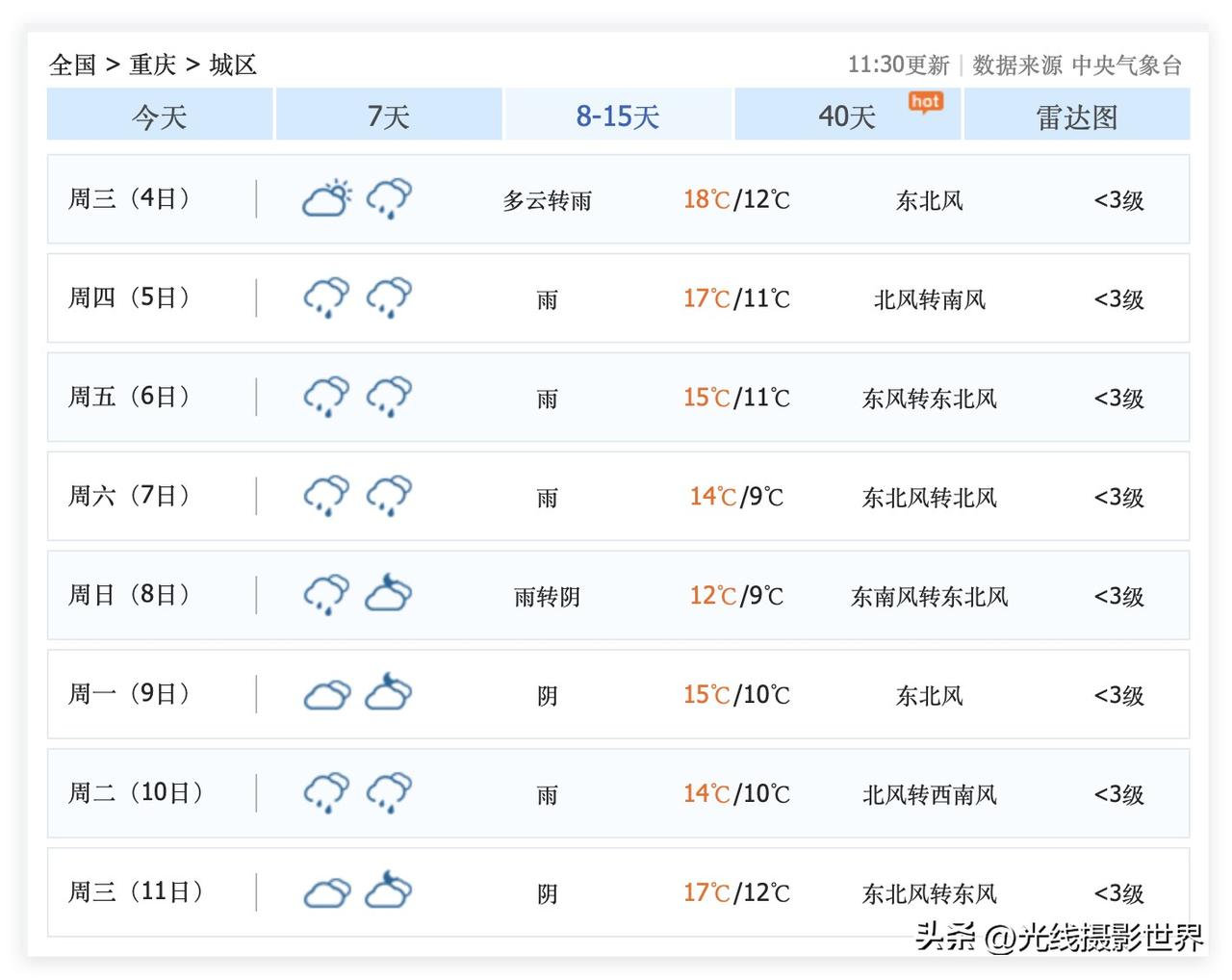 2个好消息!3月3日,元宵节的白天,重庆可能出太阳!而且,2月25日到3月11日,重庆最高气温都不会跌破10度……太棒啦! 只是,总体来说,2月28日到3月11日,重庆主城区,阴雨天比较多……经常下雨,经常阴天…… 好吧……就这样吧! 接下来,重庆主城区,总体来说,是比较不错的,就是有蓝天的晴天可能会比较少见……这对于摄影爱好者和摄影发烧友来说,可能是个问题哟!